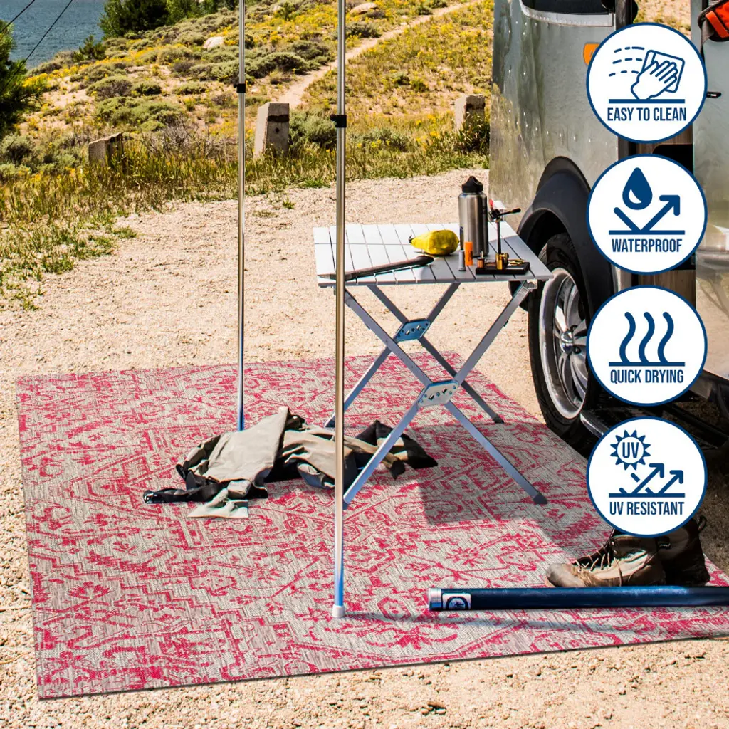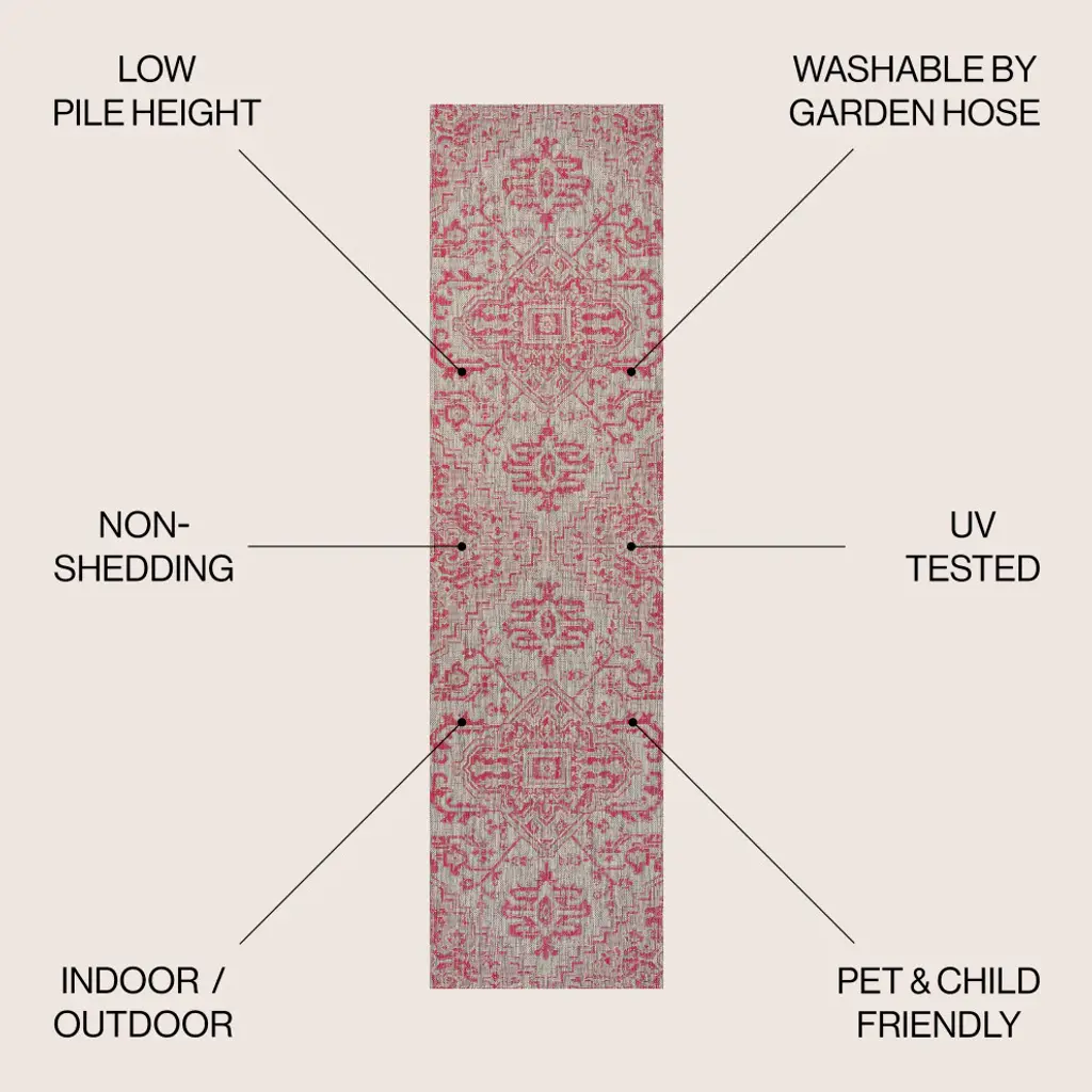 With its star-inspired medallion, this borderless rug adds dreamy Bohemian style to an outdoor porch or patio. Varied tones of red and rust on a mingled gray background give this rug a hand-woven, vintage vibe. The flatweave design is great for high-traffic spaces indoors too.Features:• Water resistance with 0.19" pile• Fuchsia and cream with a handwoven mingled texture• Flat-weave construction of 100% polypropylene• 100% Polypropylene• No backing, use of rug pad is recommended (sold separately)• Power Loomed in Turkey• Actual Dimension: 2 ft. 2 in. X 10 ft.• Color: Light Gray/Fuchsia• Thickness measures: 0.19 in.• Available in multiple sizes and/or colorsRug Care:• Vacuum regularly and spot clean as needed; avoid direct and continuous exposure to sunlight; use brushless vacuum; remove spills immediately; if liquid, blot with clean, undyed cloth by pressing firmly around the spill to absorb as much as possible; for hard to remove stains, professional rug cleaning is recommended; store in a dry, well ventilated area and rotate for consistent wear• Packing and shipping may cause temporary creases in rugs, which will flatten out after a week on the floor; to expedite the process, try back-rolling your rug before laying it down, and then allow ample time for the remaining creases to relax• Please Note: Due to differences in monitors, some rug colors may vary slightly. Lengths and widths may vary from the published dimensions. Patterns may vary slightly according to shape and size selected.About us:Style your floors with JONATHAN Y. By combining fine craftsmanship and design, this New York creative studio is bringing fashion to your floors. The collection mixes sustainable organic materials, vibrant colors and trend worthy styles to create JONATHAN Y''s distinctive catalog of rugs.
