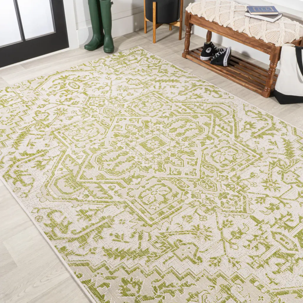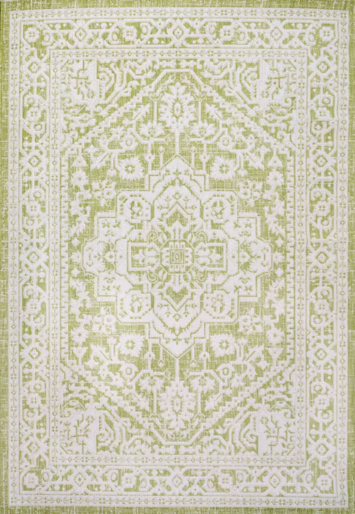 With its star-inspired medallion, this borderless rug adds dreamy Bohemian style to an outdoor porch or patio. Varied tones of red and rust on a mingled gray background give this rug a hand-woven, vintage vibe. The flatweave design is great for high-traffic spaces indoors too.Features:• Flat-weave construction of 100% polypropylene• Light gray and black with a handwoven mingled texture• Water resistance with 0.19" pile• 100% Polypropylene• No backing, use of rug pad is recommended (sold separately)• Power Loomed in Turkey• Actual Dimension: 9 ft. x 12 ft.• Color: Cream/Green• Thickness measures: 0.19 in.• Available in multiple sizes and/or colorsRug Care:• Vacuum regularly and spot clean as needed; avoid direct and continuous exposure to sunlight; use brushless vacuum; remove spills immediately; if liquid, blot with clean, undyed cloth by pressing firmly around the spill to absorb as much as possible; for hard to remove stains, professional rug cleaning is recommended; store in a dry, well ventilated area and rotate for consistent wear• Packing and shipping may cause temporary creases in rugs, which will flatten out after a week on the floor; to expedite the process, try back-rolling your rug before laying it down, and then allow ample time for the remaining creases to relax• Please Note: Due to differences in monitors, some rug colors may vary slightly. Lengths and widths may vary from the published dimensions. Patterns may vary slightly according to shape and size selected.About us:Style your floors with JONATHAN Y. By combining fine craftsmanship and design, this New York creative studio is bringing fashion to your floors. The collection mixes sustainable organic materials, vibrant colors and trend worthy styles to create JONATHAN Y''s distinctive catalog of rugs.
