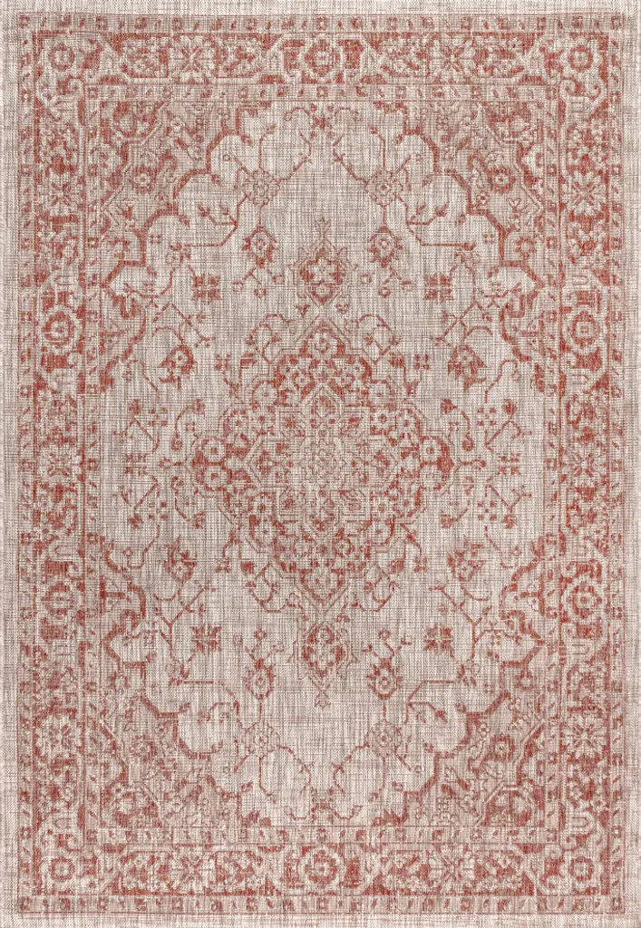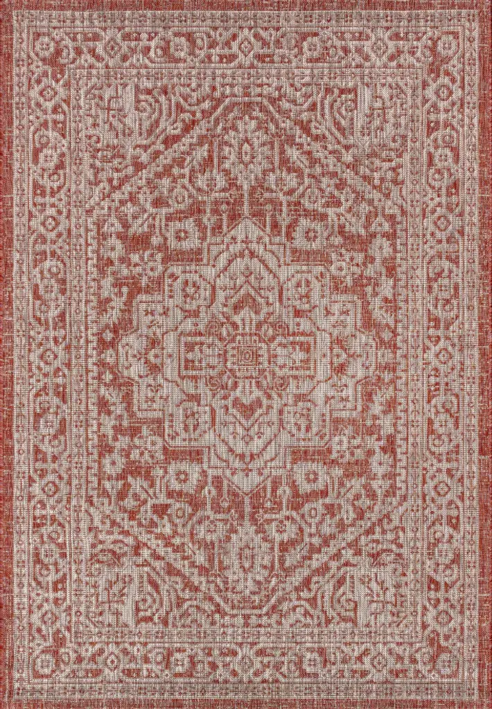 With its star-inspired medallion, this borderless rug adds dreamy Bohemian style to an outdoor porch or patio. Varied tones of red and rust on a mingled gray background give this rug a hand-woven, vintage vibe. The flatweave design is great for high-traffic spaces indoors too. Features:• Flat-weave construction of 100% polypropylene• Red and taupe with a handwoven mingled texture• Water resistance with 0.19" pile• 100% Polypropylene• No backing, use of rug pad is recommended (sold separately)• Power Loomed in Turkey• Actual Dimension: 5 ft. 3 in. x 7 ft. 7 in.• Color: Red/Taupe• Thickness measures: 0.19 in.• Available in multiple sizes and/or colorsRug Care:• Durable and easy-care - just sweep or hose down with mild soap and water• Packing and shipping may cause temporary creases in rugs, which will flatten out after a week on the floor; to expedite the process, try back-rolling your rug before laying it down, and then allow ample time for the remaining creases to relax• Please Note: Due to differences in monitors, some rug colors may vary slightly. Lengths and widths may vary from the published dimensions. Patterns may vary slightly according to shape and size selected.About us:Style your floors with JONATHAN Y. By combining fine craftsmanship and design, this New York creative studio is bringing fashion to your floors. The collection mixes sustainable organic materials, vibrant colors and trend worthy styles to create JONATHAN Y''s distinctive catalog of rugs.
