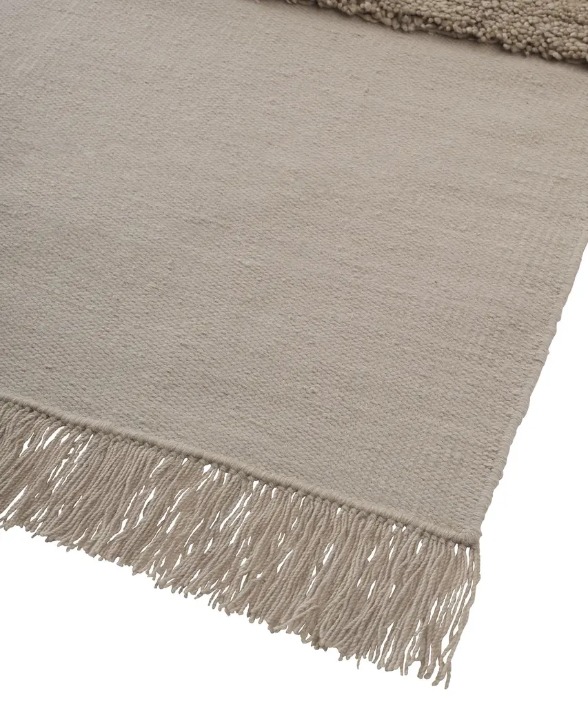 A stunning and original hand-knotted shag pile rug from Linie Design. Eternal Eye combines a uniquely rounded shape with textural contrasts to create a characterful rug that appeals to all the senses. The neutral color palette ensures the focus remains on the structure, as it shifts from thick and sumptuous pile to flat-woven, before finishing with generous fringing at the end. Made in a combination of soft RWS wool and GOTS-certified cotton warp-both materials selected for their eco-friendly qualities, durability, and natural rustic beauty. Hand-crafted by Linie Design’s artisan weavers and designed by Urd Moll Gundermann, Eternal Eye is part of the Apertus Collection that focuses on structure and sustainability to create stunning, responsibly produced rugs that feature the Care & Fair label. Designed by Danish textile design company Linie Designs - proud members of 'Fair and Care' promoting fair working conditions.