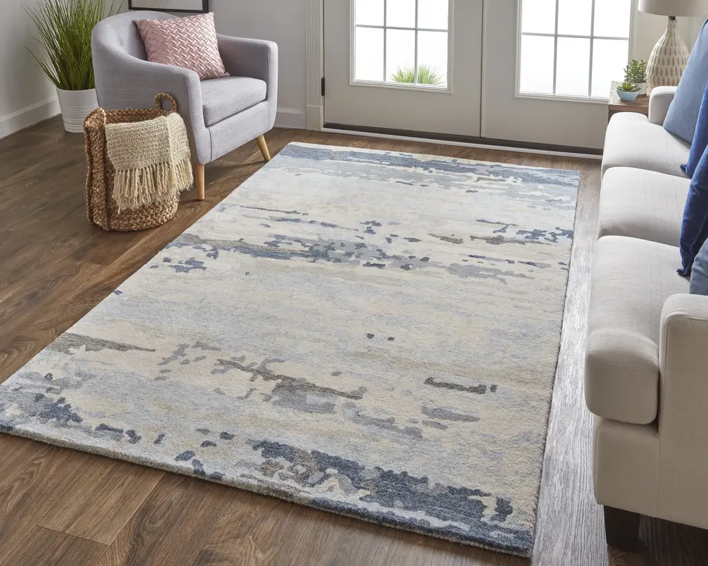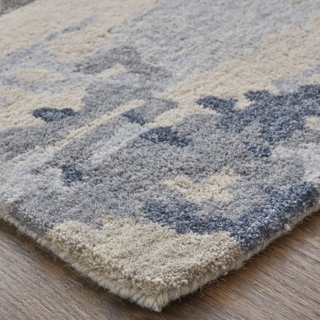 Collection: Everley Colors: Blue, Gray, Ivory Construction: Hand Tufted Material: Face: 100%Wool / Warp: Cotton Pile: Low Pile Pile Height: 0.47" Styles: Contemporary,Casual Backing: Cotton Made In: India Thickness: 0.47" Price Range: $$$$$ (Affordable)