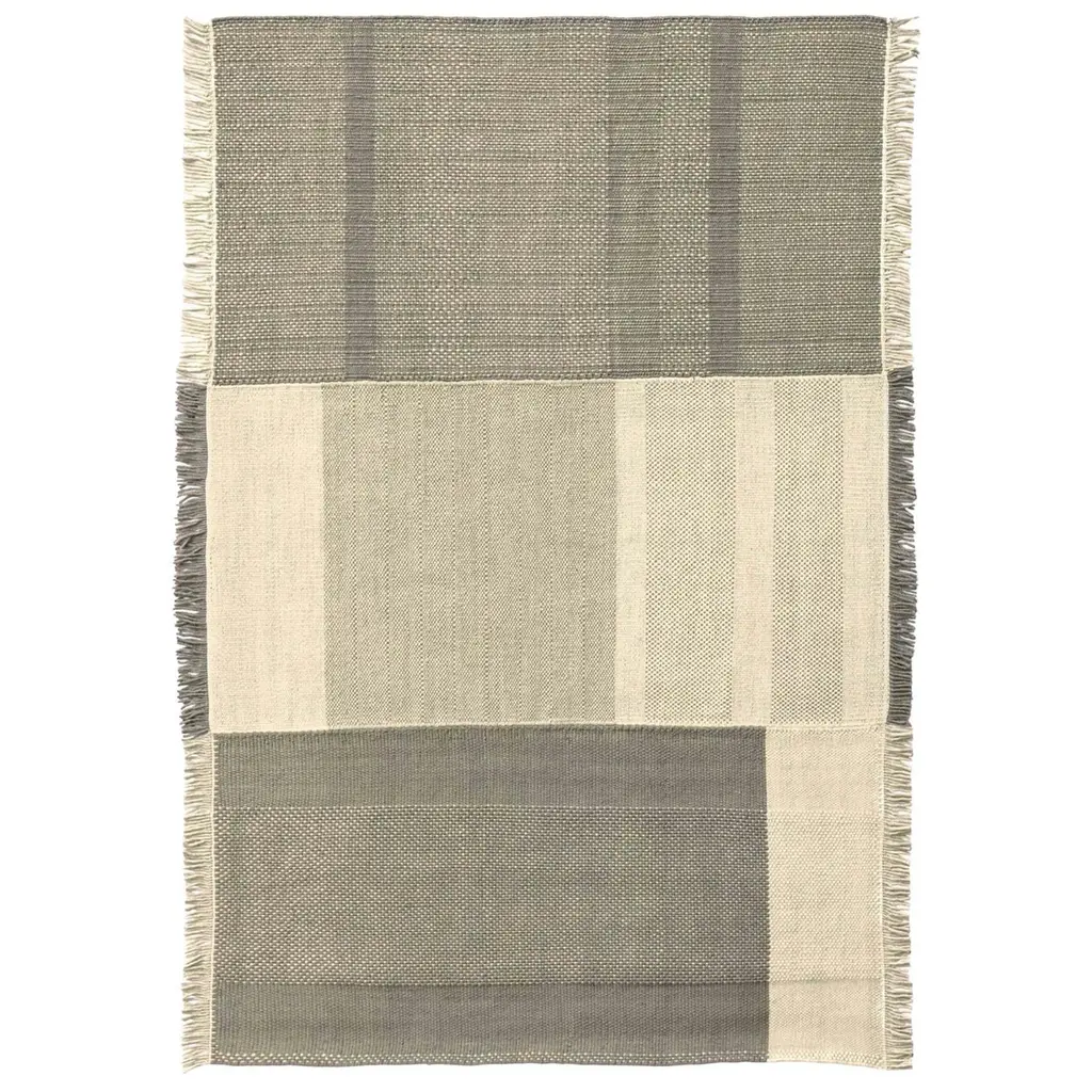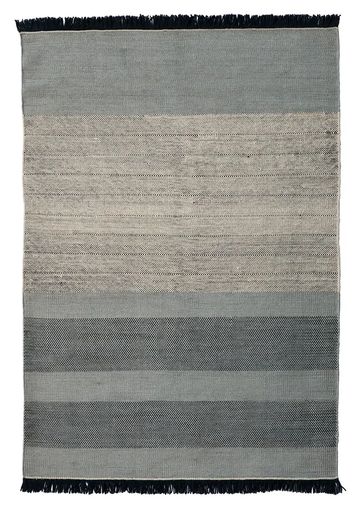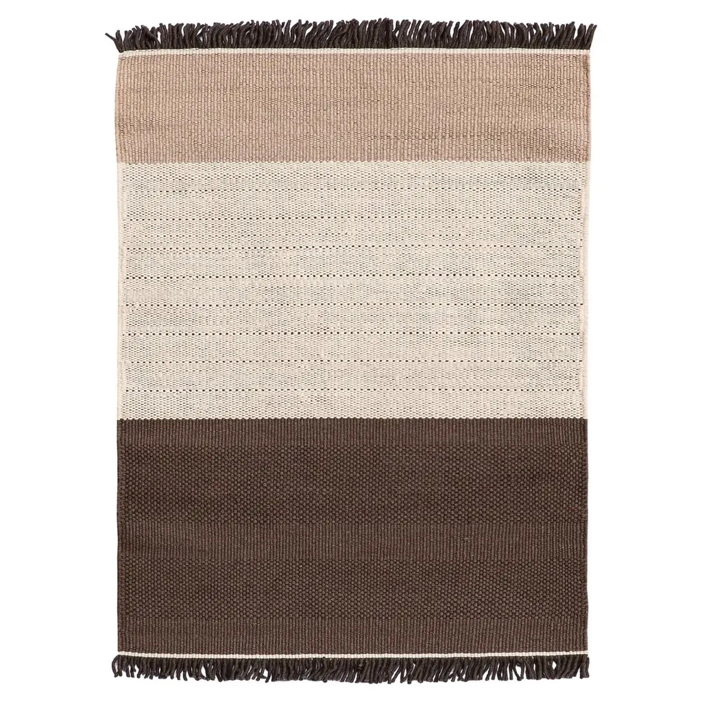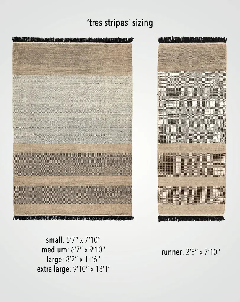 Extra Large 'Tres Stripes' hand-loomed rug for Nanimarquina.Fabricated from a natural blend of New Zealand wool, felt, and cotton, 'Tres' is a traditional Indian flat-weave Dhurrie rug. Its unique quality lies in the production of three independent parts in which the different fibers are allowed to shine. The commingling of the three materials highlight subtle changes in tone and irregularities in the weave, bringing the handmade nature of this pattern brilliantly to life.Nani Marquina founded her namesake company in 1987 in Barcelona. More than 30 years later, the company continues to offer artisanal rugs worldwide without compromising on design, quality, or aesthetics. Each rug is crafted with respect for the environment, with outdoor rugs made from 100% recycled PET in an innovative process that reduces up to 70% of water waste.Price is per item. Available in unlimited quantities in five standard sizes and in choice of black, blue, salvia, ochre, green, chocolate and pearl. This listing is for the extra large sized rug; please specify color when ordering.Custom sizes available upon request for an additional fee and with extended lead times possible.In-stock lead time 11-12 weeks. Out of stock or custom sizing can add additional 14 weeks or more. Inventory availability subject to change at any time.Please note that due to the organic and handmade nature of this fiber some variation in color may occur from piece to piece, which may become further pronounced with prolonged exposure to sunlight. Only one representative example of the rugs is shown in the images.Also note this item must ship directly from Nanimarquina’s fulfillment center, so 1st Dibs arranged shipping and local pick-up are not an option. Shipping cost quoted is per item and cannot be combined.Hand made to order. All sales are final.