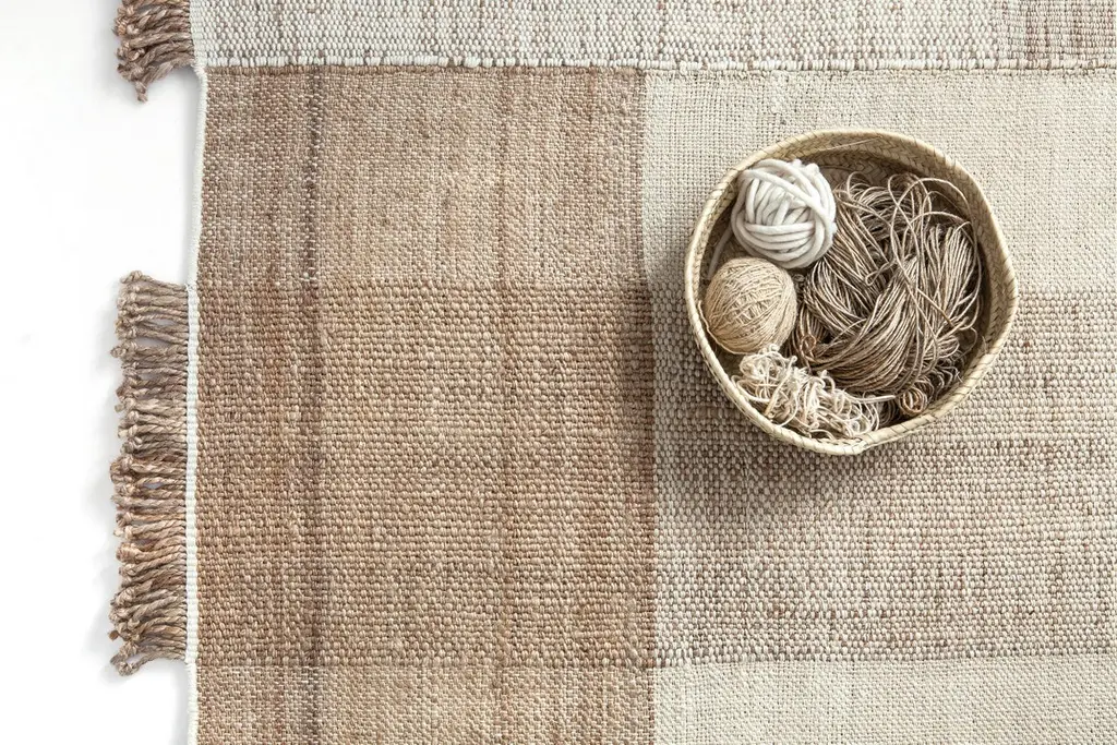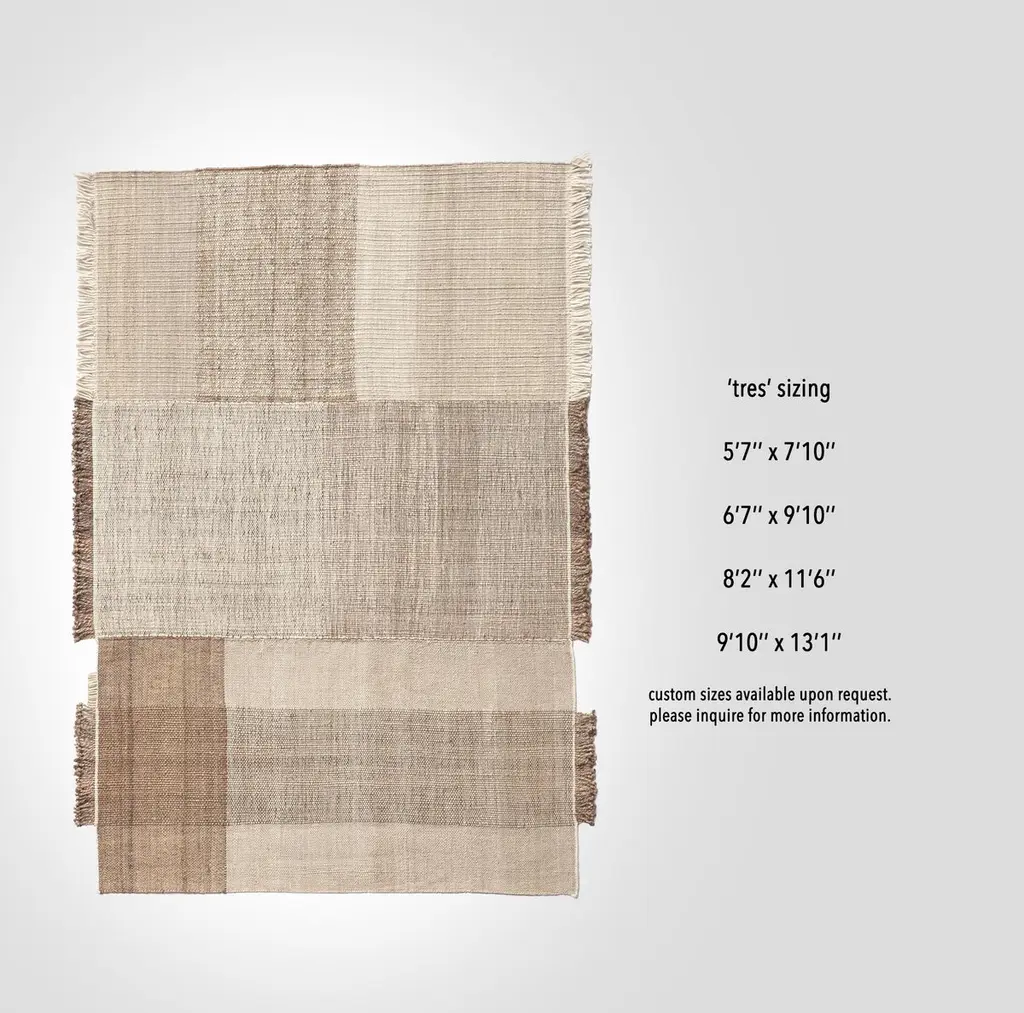 Extra large 'tres vegetal' hand-loomed rug for Nanimarquina.Fabricated from a natural blend of New Zealand wool, felt, and jute, 'Tres Vegetal' is a traditional Indian flat-weave Dhurrie rug. Its unique quality lies in the production of three independent parts in which the different fibers are allowed to shine. The commingling of the materials highlight subtle changes in tone and irregularities in the weave, bringing the handmade nature of this pattern brilliantly to life. The addition of biodegradable Jute in this 'Vegetal' version of the rug emphasizes the brand's passion for nature.Nani Marquina founded her namesake company in 1987 in Barcelona. More than 30 years later, the company continues to offer artisanal rugs worldwide without compromising on design, quality, or aesthetics. Each rug is crafted with respect for the environment, with outdoor rugs made from 100% recycled PET in an innovative process that reduces up to 70% of water waste.Price is per item. Available in unlimited quantities in four standard sizes. This listing is for the extra large-sized rug. Custom sizes available upon request for an additional fee and with extended lead times possible.In-stock lead time 2-3 weeks. Out of stock or custom sizing can add additional 14 weeks or more. Inventory availability subject to change at any time.Please note that due to the organic and handmade nature of this fiber some variation in color may occur from piece to piece, which may become further pronounced with prolonged exposure to sunlight. Only one representative example of the rugs is shown in the images.Also note this item must ship directly from Nanimarquina’s fulfillment center, so 1st Dibs arranged shipping and local pick-up are not an option. Shipping cost quoted is per item and cannot be combined.Hand made to order. All sales are final.
