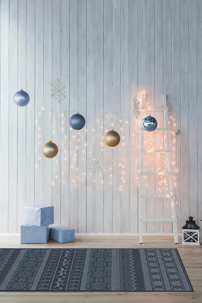 Inspired by the traditional, hand-knitted designs of its namesake, our Fair Isle Blue Rug features a multi-band of intricate and festive designs, including poinsettias, holiday trees, and reindeer, in hues of Nordic and midnight blue. Water-resistant, stain-resistant, and machine-washable.