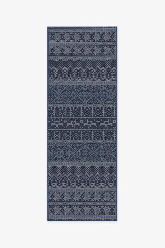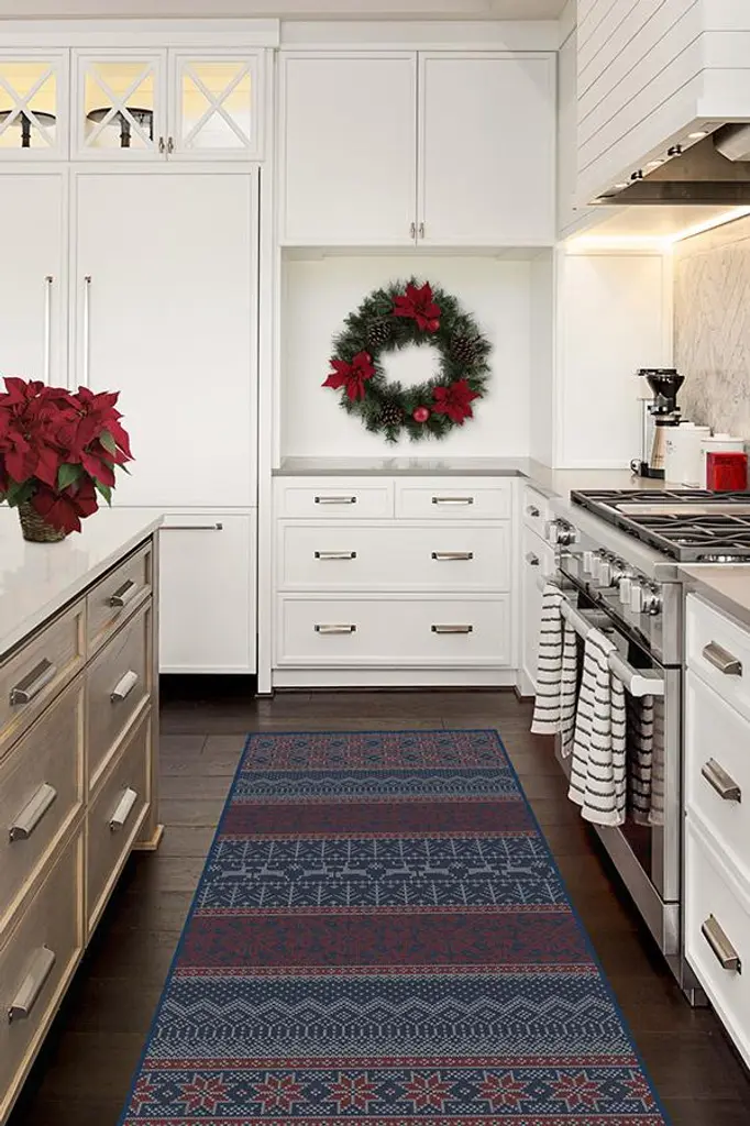 Inspired by the traditional, hand-knitted designs of its namesake, our Fair Isle Red Rug features a multi-band of intricate and festive designs, including poinsettias, holiday trees, and reindeer, in hues of tomato red and navy blue. Water-resistant, stain-resistant, and machine-washable.