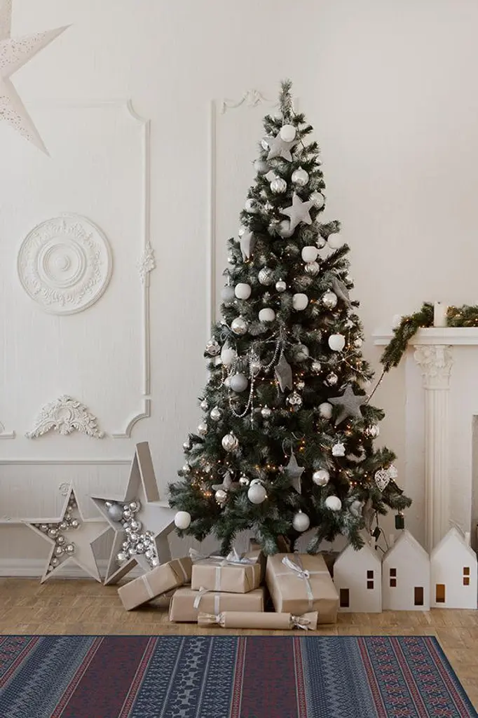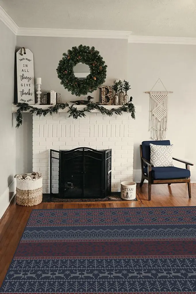 Inspired by the traditional, hand-knitted designs of its namesake, our Fair Isle Red Rug features a multi-band of intricate and festive designs, including poinsettias, holiday trees, and reindeer, in hues of tomato red and navy blue. Water-resistant, stain-resistant, and machine-washable.