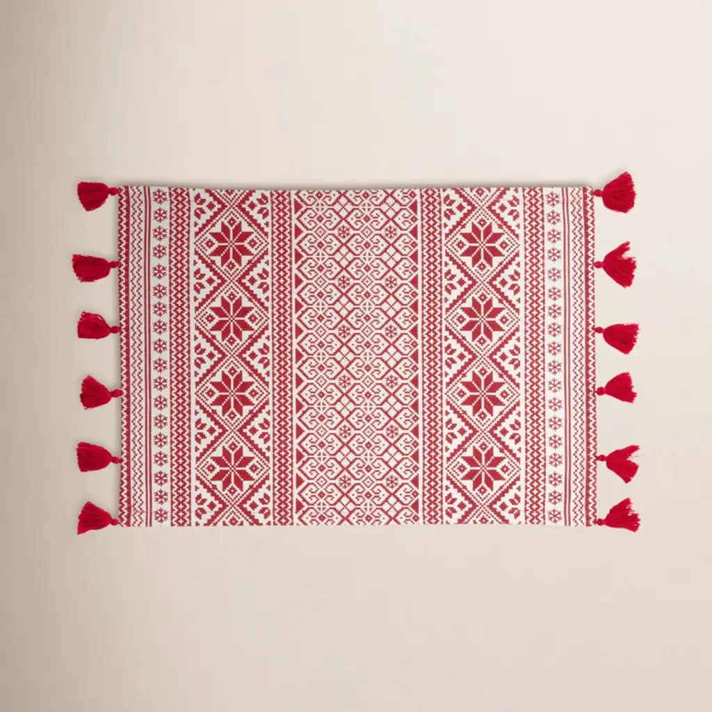 Inspired by the traditional, hand-knitted designs of its namesake, our Fair Isle Red Rug features a multi-band of intricate and festive designs, including poinsettias, holiday trees, and reindeer, in hues of tomato red and navy blue. Water-resistant, stain-resistant, and machine-washable.