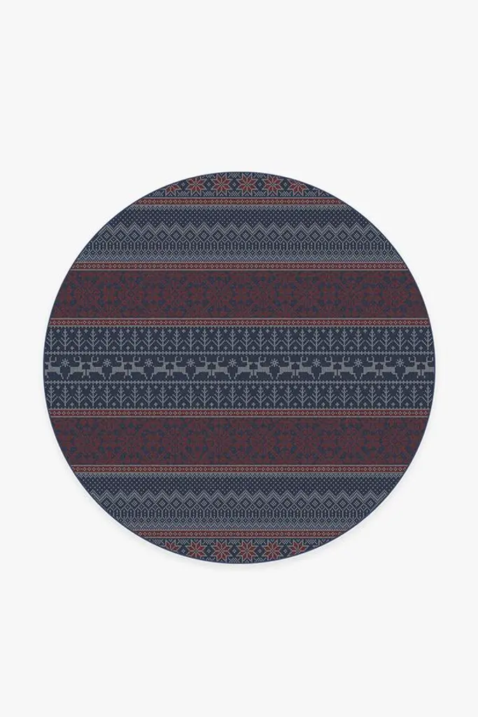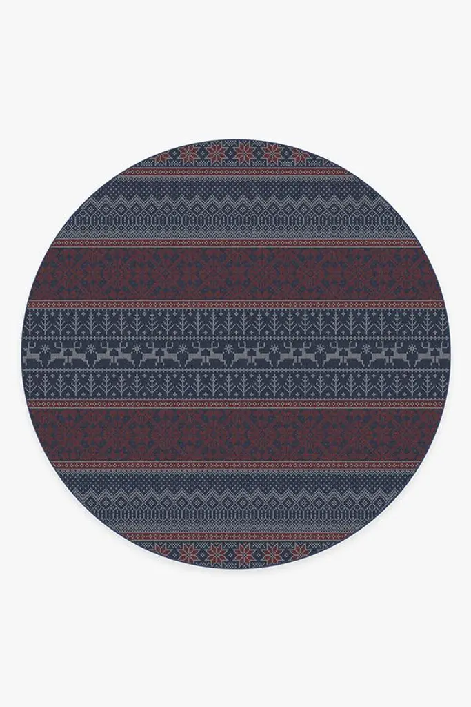 Inspired by the traditional, hand-knitted designs of its namesake, our Fair Isle Red Rug features a multi-band of intricate and festive designs, including poinsettias, holiday trees, and reindeer, in hues of tomato red and navy blue. Water-resistant, stain-resistant, and machine-washable.
