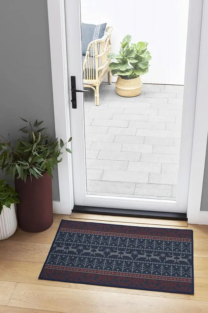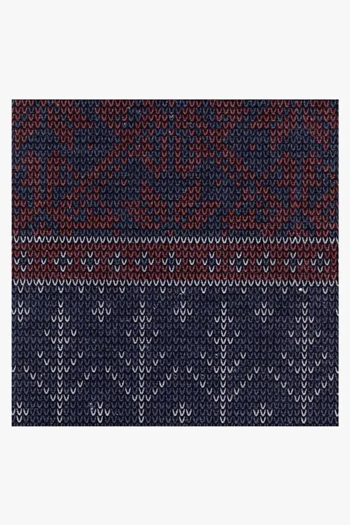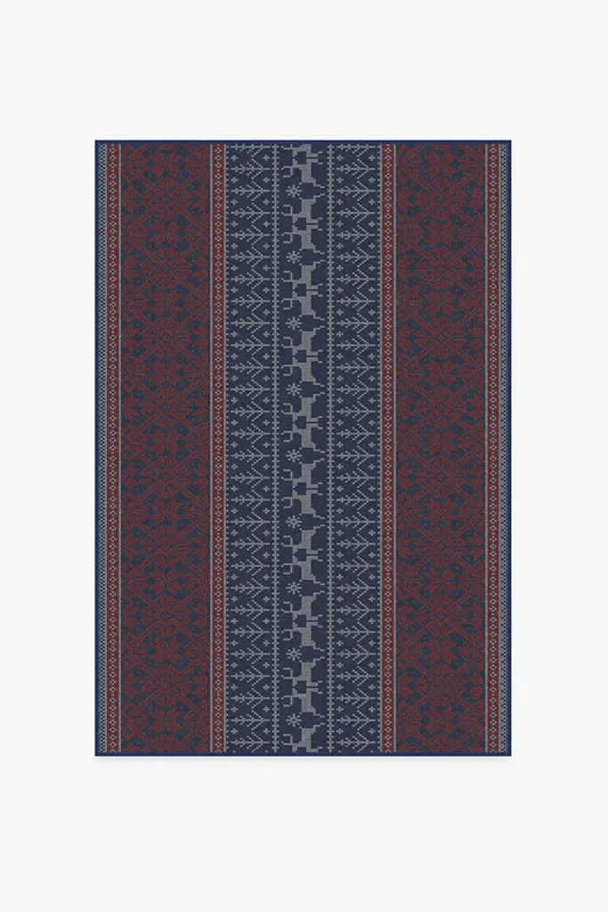 Inspired by the traditional, hand-knitted designs of its namesake, our Fair Isle Red Rug features a multi-band of intricate and festive designs, including poinsettias, holiday trees, and reindeer, in hues of tomato red and navy blue. Water-resistant, stain-resistant, and machine-washable.