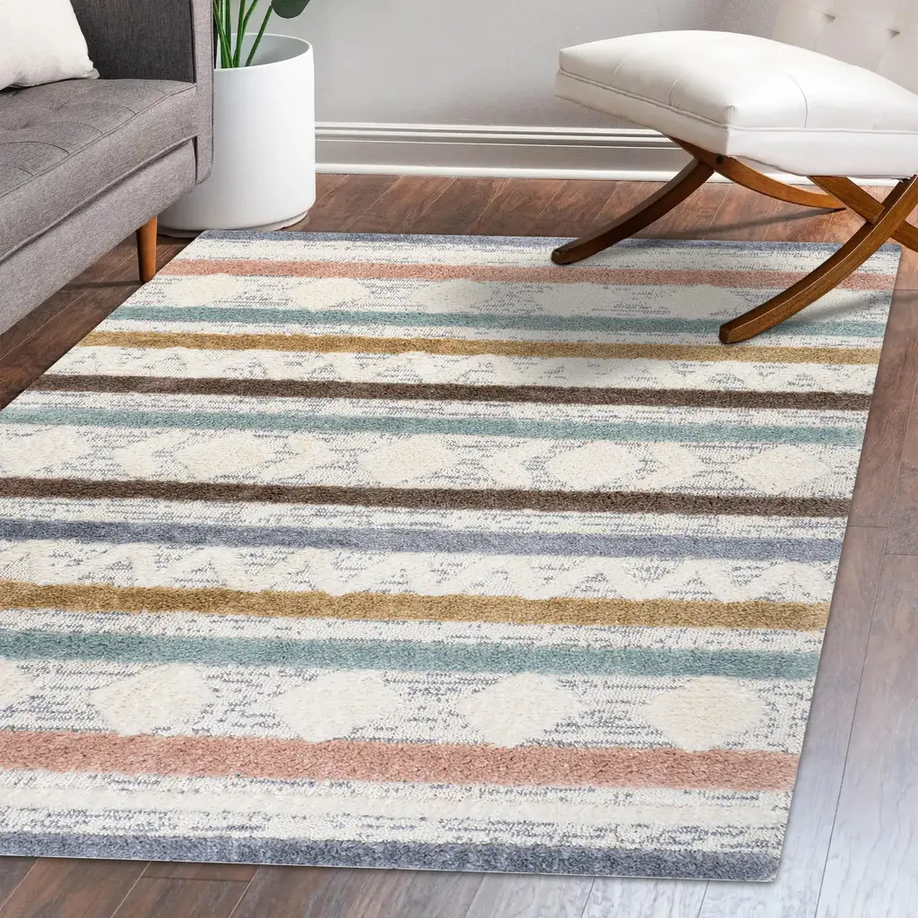 Right on trend, this rug features textured stripes and Moroccan geometric shapes woven in Boho-inspired pastels and earthy shades. Versatile rug features two different pile heights for soft texture in the living room, bedroom or home office. Woven from easy-care yarns, the family-friendly pattern adds texture and soft color to mid-century, transitional and modern interiors.