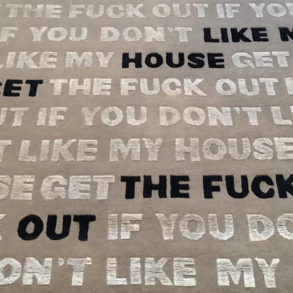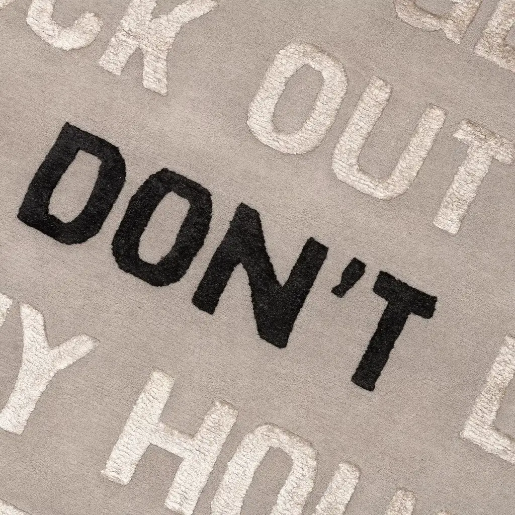 Ironic and provocative, this precious rug in 50% silk and 50% Himalayan wool is the result of an artisan process of knotting executed by master craftsmen in Nepal. The brown lettering playfully inviting to step out in case of guest's dislike is set against a taupe background with beige-toned lettering endlessly repeating the message. The base is .05cm high, while the design is .07cm high. Anti-stain treatment and a wide variety of customization options are available, please ask the Concierge for details.