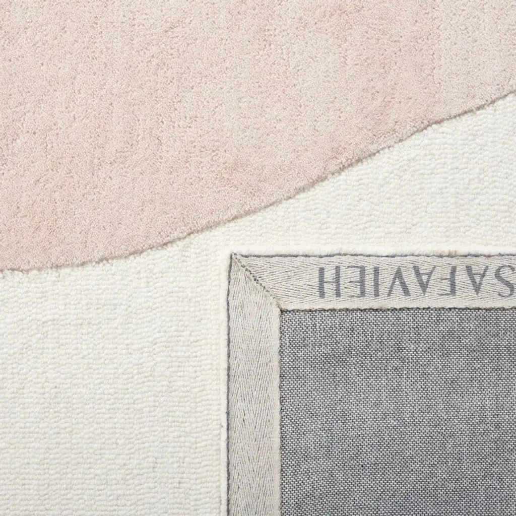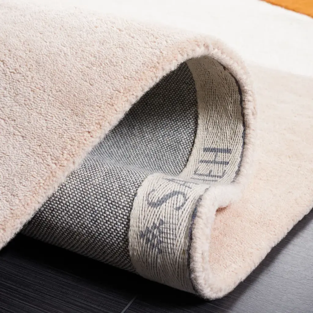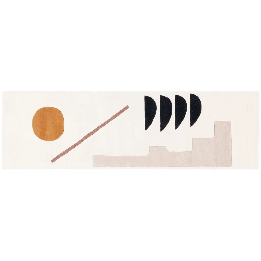 This abstract area rug is defined by its freeform shapes + fresh use of color. Arched stripes evoke the lines of a topographic map, while a splashes of blush pink + sunny orange pop against the ivory field. It’s hand-tufted from wool in a medium pile height that combines softness + strength.