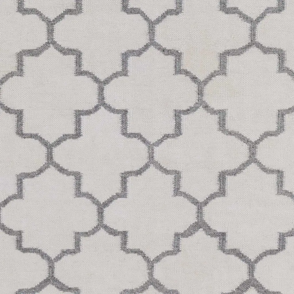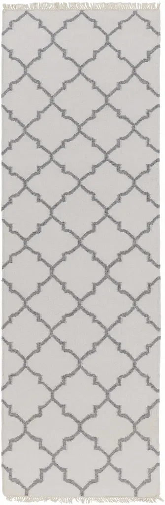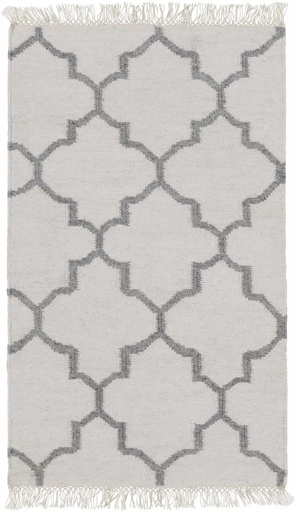 Collection: Fellsmere Colors: Charcoal, Ivory Construction: Hand Woven Material: 80% Wool,20% Viscose Pile: No Pile Styles: Transitional Made In: India Thickness: 0.07" Fringe Length: 1.5" Price Range: $$$$$ (Affordable)