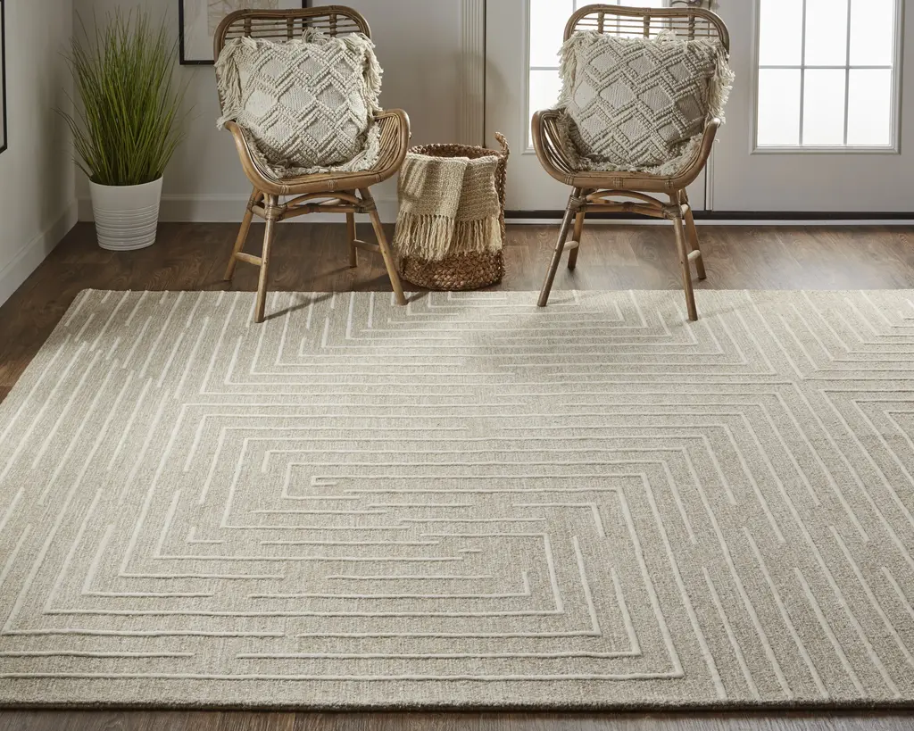 Collection: Fenner Colors: Taupe, Ivory Construction: Hand Tufted Material: Face: 100%Wool / Warp: Cotton Pile: Low Pile Pile Height: 0.31" Styles: Transitional,Farmhouse,Casual Backing: Cotton Made In: India Thickness: 0.31" Price Range: $$$$$ (Affordable)