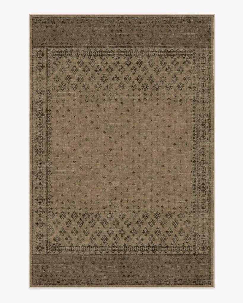Bring home a unique Spanish-rustic vibe with our Fernanda Black & Tan Rug. With its rich earthy tones and natural-inspired textures, this geometric design features small, global shapes thoughtfully arranged in a traditional bordered layout. Deep charcoal black motifs are elegantly blended into the warm tan background, creating an authentic, vintage feel. Water-resistant, stain-resistant, and machine-washable. Rug colors may vary slightly according to your device and the lighting in your space.