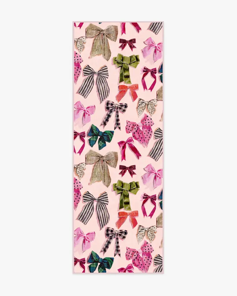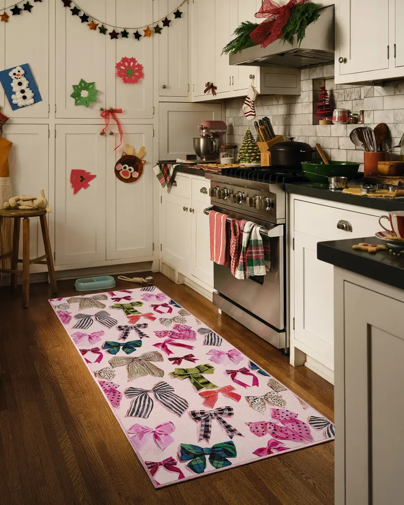 This rug is the ultimate gift—no wrapping required. The Festive Bows Pink Multicolor Rug is your go-to for turning any space into a merry moment, thanks to its soft pink background and a parade of playful bows in pinks, greens, burgundy, and pops of black and white. Water-resistant, stain-resistant, and machine-washable. Colors may vary by device and lighting.