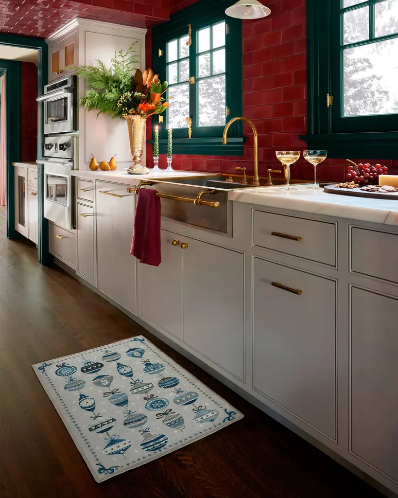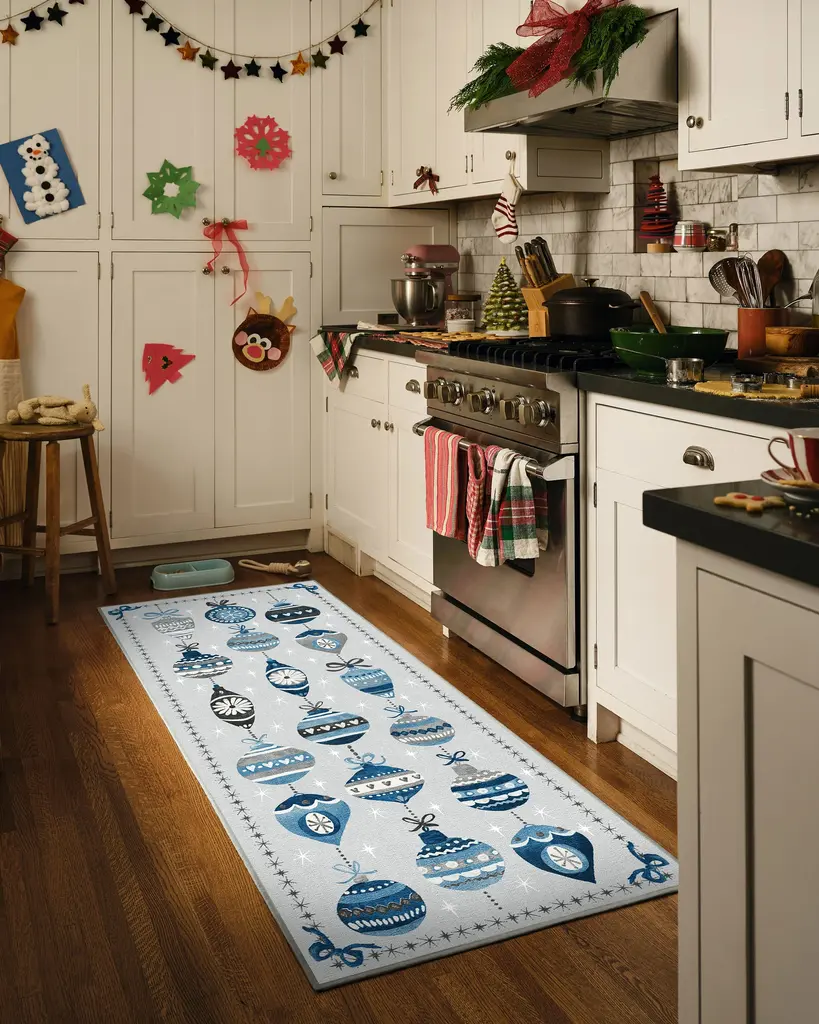 Relive your childhood yuletide memories with our Festive Garland Blue Flatwoven Rug. The colorful design features retro-style ornaments bordered by stars and ribbons in shades of blue, grey, and silver with hints of charcoal on a distressed black background. Water-resistant, stain-resistant, and machine-washable. Colors may vary by device and lighting.