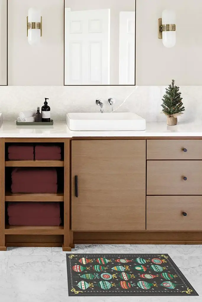 Relive your childhood yuletide memories with our Festive Garland Holiday Multicolor Rug. The colorful design features retro-style ornaments bordered by stars and ribbons in turquoise, evergreen, and farmhouse red on a distressed black background. Water-resistant, stain-resistant, and machine-washable.