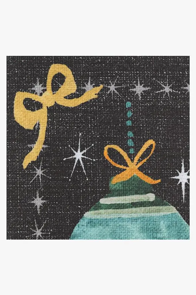 Relive your childhood yuletide memories with our Festive Garland Holiday Multicolor Rug. The colorful design features retro-style ornaments bordered by stars and ribbons in turquoise, evergreen, and farmhouse red on a distressed black background.