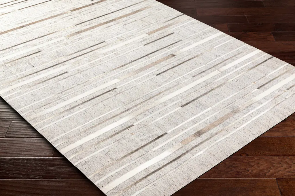 Collection: Fico Colors: Taupe, Ivory, Tan, DarkBrown Construction: Hand Crafted Material: 65% Viscose,35% Leather Pile: No Pile Styles: Contemporary Backing: Felt Made In: India Thickness: 0.14" Price Range: $$$$$ (Affordable)