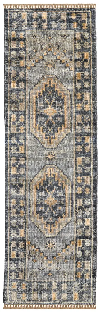 Collection: Fillmore Colors: Blue, Gray Construction: Hand Knotted Material: Face: 100%Wool Pile: Low Pile Pile Height: 0.4" Styles: Transitional,Vintage,Bohemian & Eclectic Backing: N/A Made In: India Thickness: 0.4" Price Range: $$$$$ (Premium)