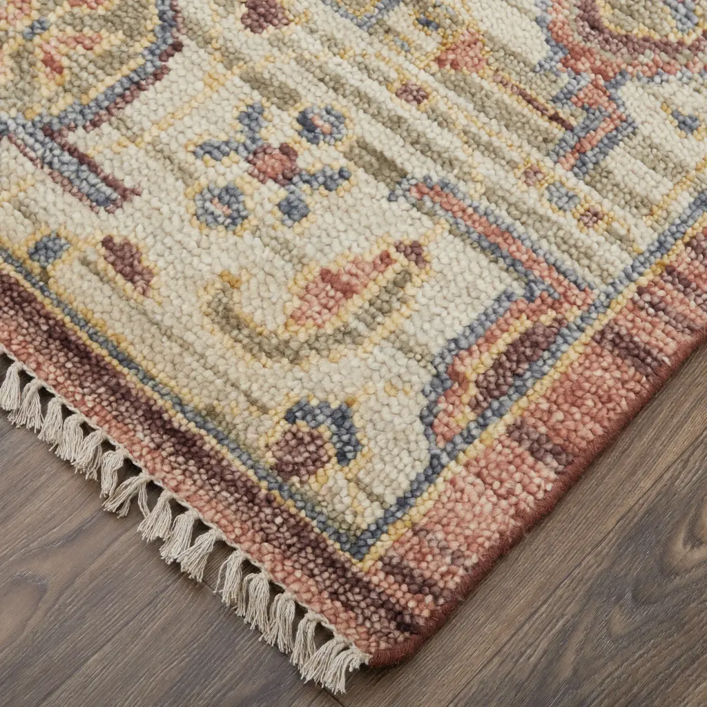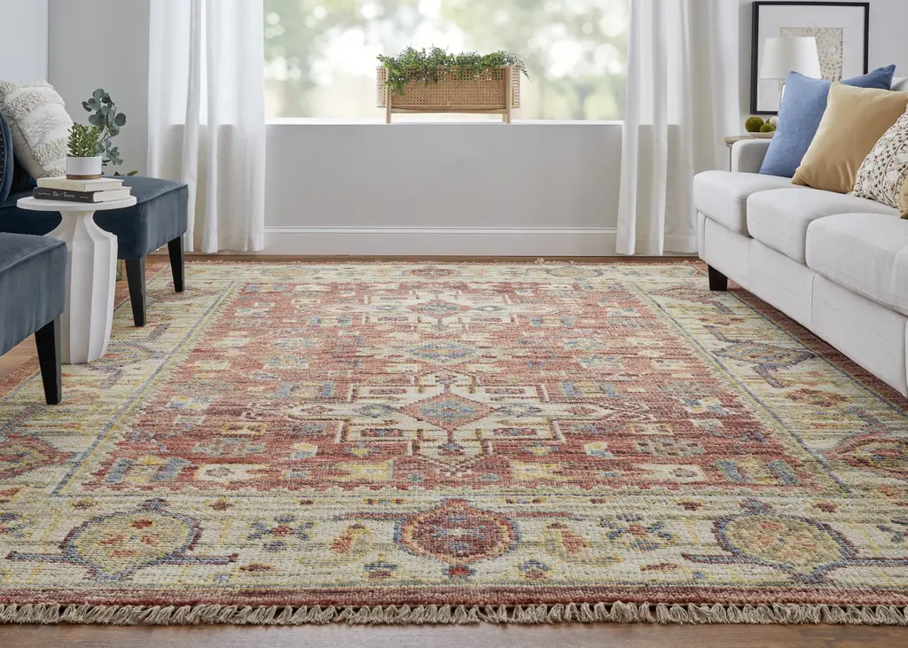 Collection: Fillmore Colors: Red, Ivory, Gold Construction: Hand Knotted Material: Face: 100%Wool Pile: Low Pile Pile Height: 0.4" Styles: Transitional,Bohemian Backing: N/A Made In: India Thickness: 0.4" Price Range: $$$$$ (Premium)