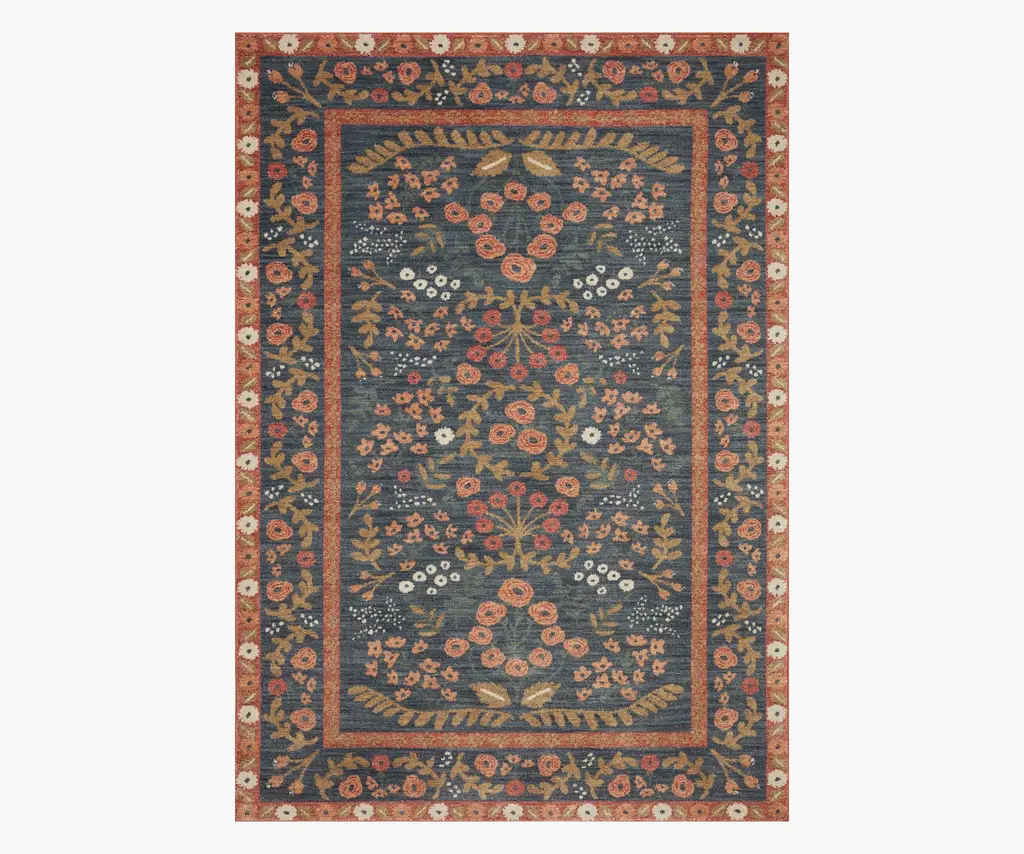 The Florence rug features our signature flowers blooming in a mirrored motif, bracketed by sprays of delicate leaves. Powerloomed in Egypt, it has a soft, shed-resistant pile that is both fade and stain resistant. Part of our Rifle Paper Co. × Loloi collection. The layout and scale of our rugs is adjusted to accommodate each available size, and may be different than what is pictured here. Images of each size are available by hovering over the desired size on our desktop site.