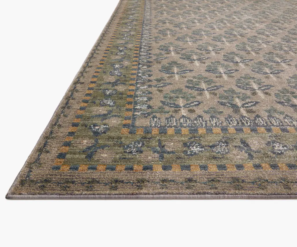 A field of delicate flowers takes on an almost geometric feel on the Forte rug. The detailed floral grid is surrounded by a layered border with pops of unexpected colors. Powerloomed in Egypt, it has a soft, shed-resistant pile that is both fade and stain resistant. Part of our Rifle Paper Co. × Loloi collection. The layout and scale of our rugs is adjusted to accommodate each available size, and may be different than what is pictured here. Images of each size are available by hovering over the desired size on our desktop site.