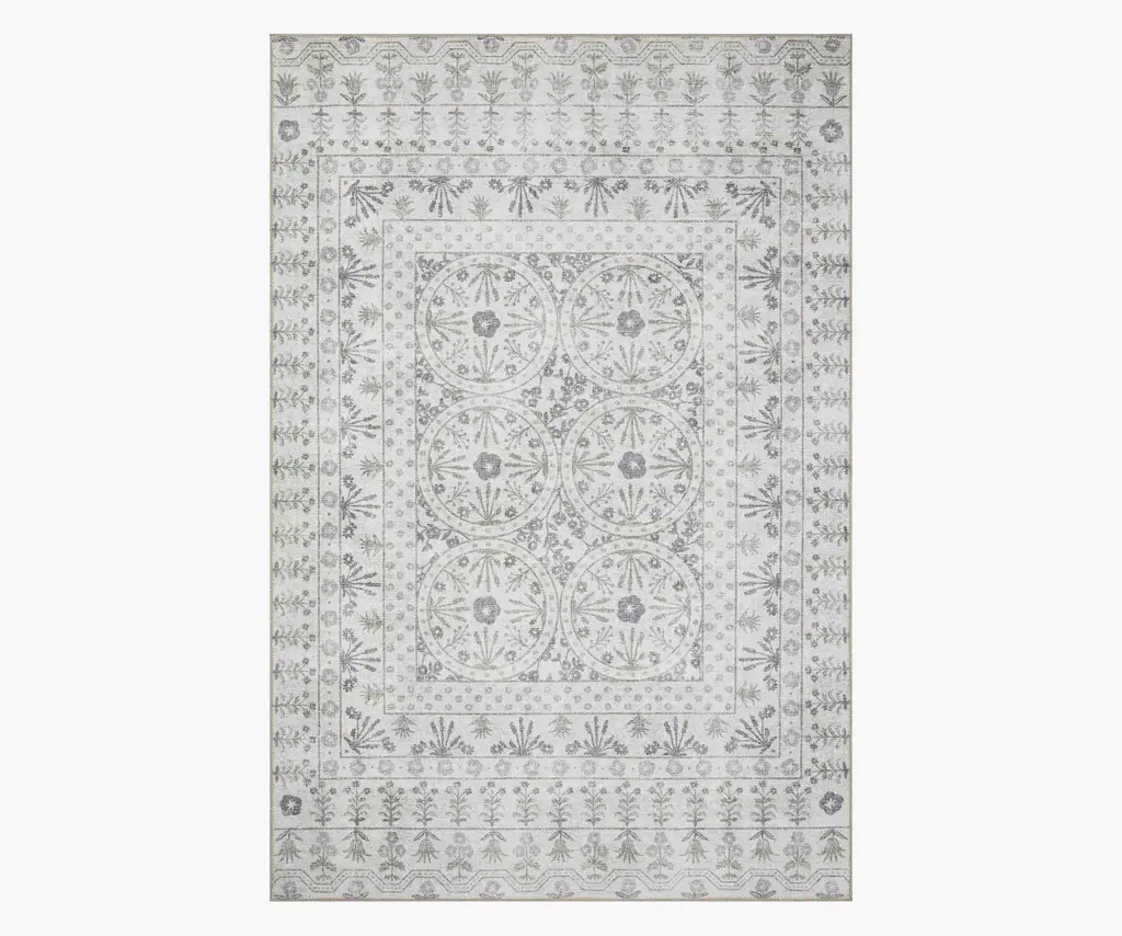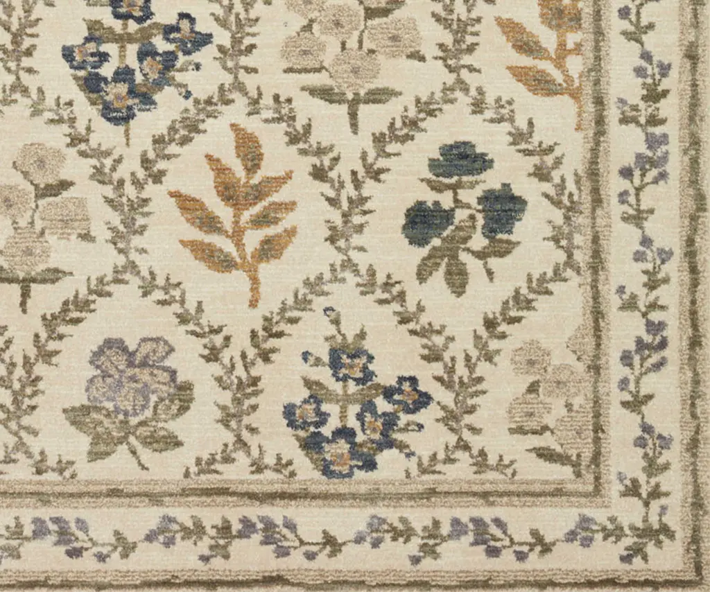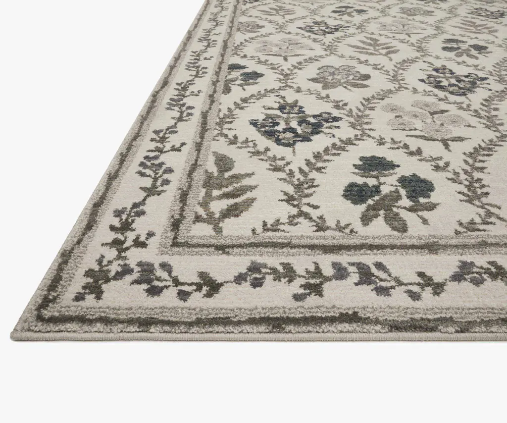 Our Hawthorne rug features sprays of assorted flowers standing under delicate arches, creating a botanical grid with a vintage feel. Powerloomed in Egypt, it has a soft, shed-resistant pile that is both fade and stain resistant. Part of our Rifle Paper Co. × Loloi collection. The layout and scale of our rugs is adjusted to accommodate each available size, and may be different than what is pictured here. Images of each size are available by hovering over the desired size on our desktop site.