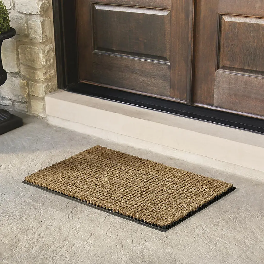 Tufts of naturally strong shredded coconut husks pair with a thick rubber backing for superior absorbency and grip. The richly textured surface of our handwoven Fischer Door Mat scrapes away dirt while the rubberized bottom reduces shedding and prevents skidding. 50% coir fibers, 50% rubber 0.8" thick Finished edges Handwoven Color: Natural Black rubber backing Add an outdoor rug pad (sold separately) to increase water drainage and prevent slippingPlace in a sheltered area View complete care instructions Do not place in area where it will remain wet for long periods of time with no sunlight for drying Not recommended for use on porcelain, natural stone, slate, granite, cobblestone, or limestone porches that have been chemically sealed Imported At Frontgate, our primary focus is quality. We guarantee that every product we sell will stand up to the supreme test – our customers' satisfaction. To learn more about our policies, visit our Shipping & Processing, Returns & Exchanges and Warranty & Price Guarantee pages. Tufts of naturally strong shredded coconut husks pair with a thick rubber backing for superior absorbency and grip. The richly textured surface of our handwoven Fischer Door Mat scrapes away dirt while the rubberized bottom reduces shedding and prevents skidding. 50% coir fibers, 50% rubber 0.8" thick Finished edges Handwoven Color: Natural Black rubber backing Add an outdoor rug pad (sold separately) to increase water drainage and prevent slippingPlace in a sheltered area View complete care instructions Do not place in area where it will remain wet for long periods of time with no sunlight for drying Not recommended for use on porcelain, natural stone, slate, granite, cobblestone, or limestone porches that have been chemically sealed Imported At Frontgate, our primary focus is quality. We guarantee that every product we sell will stand up to the supreme test – our customers' satisfaction. To learn more about our policies, visit our Shipping & Processing, Returns & Exchanges and Warranty & Price Guarantee pages.
