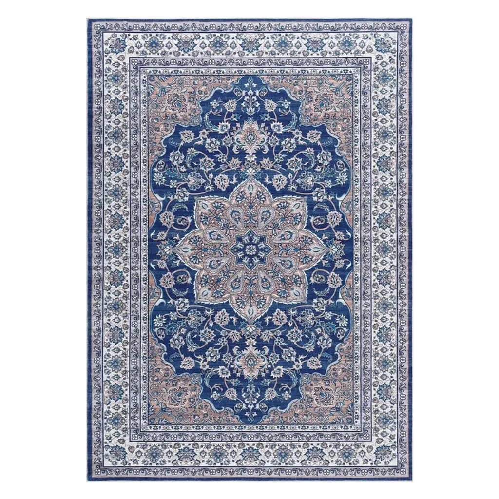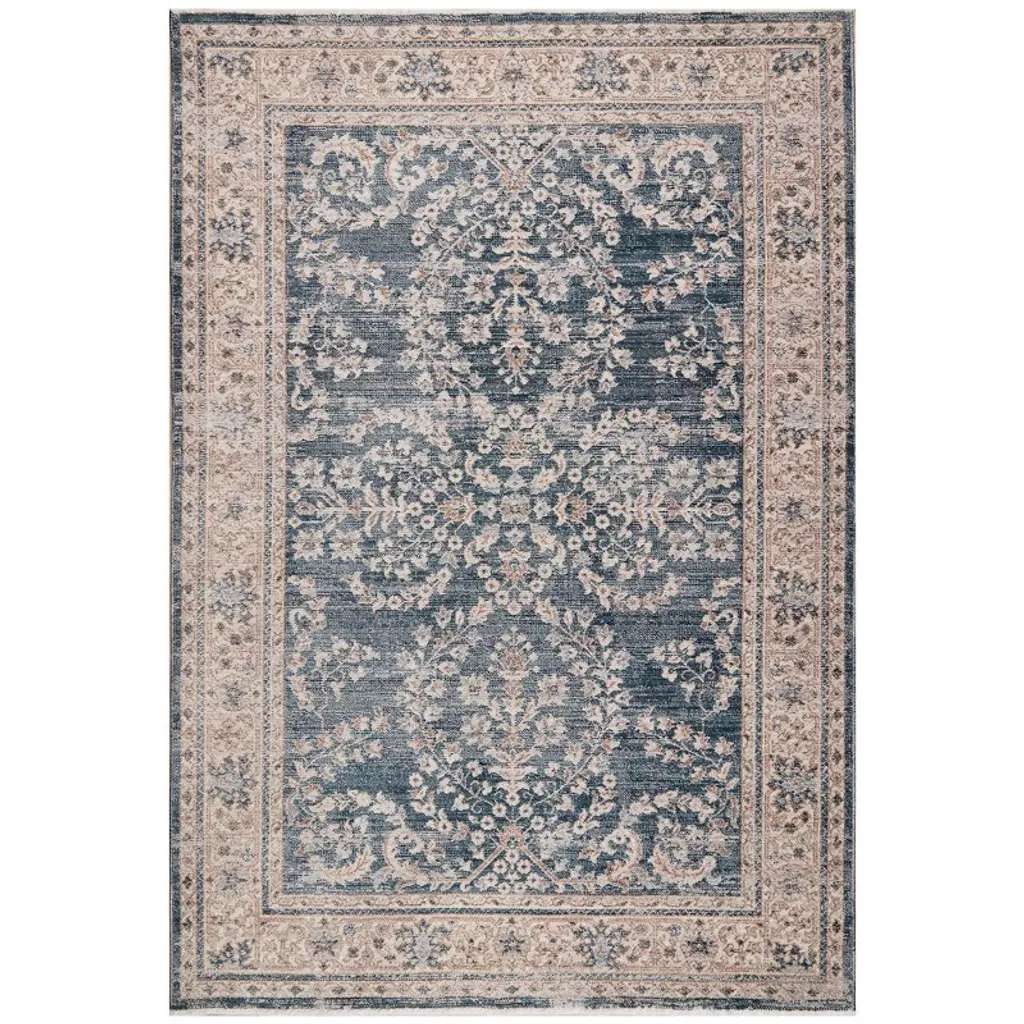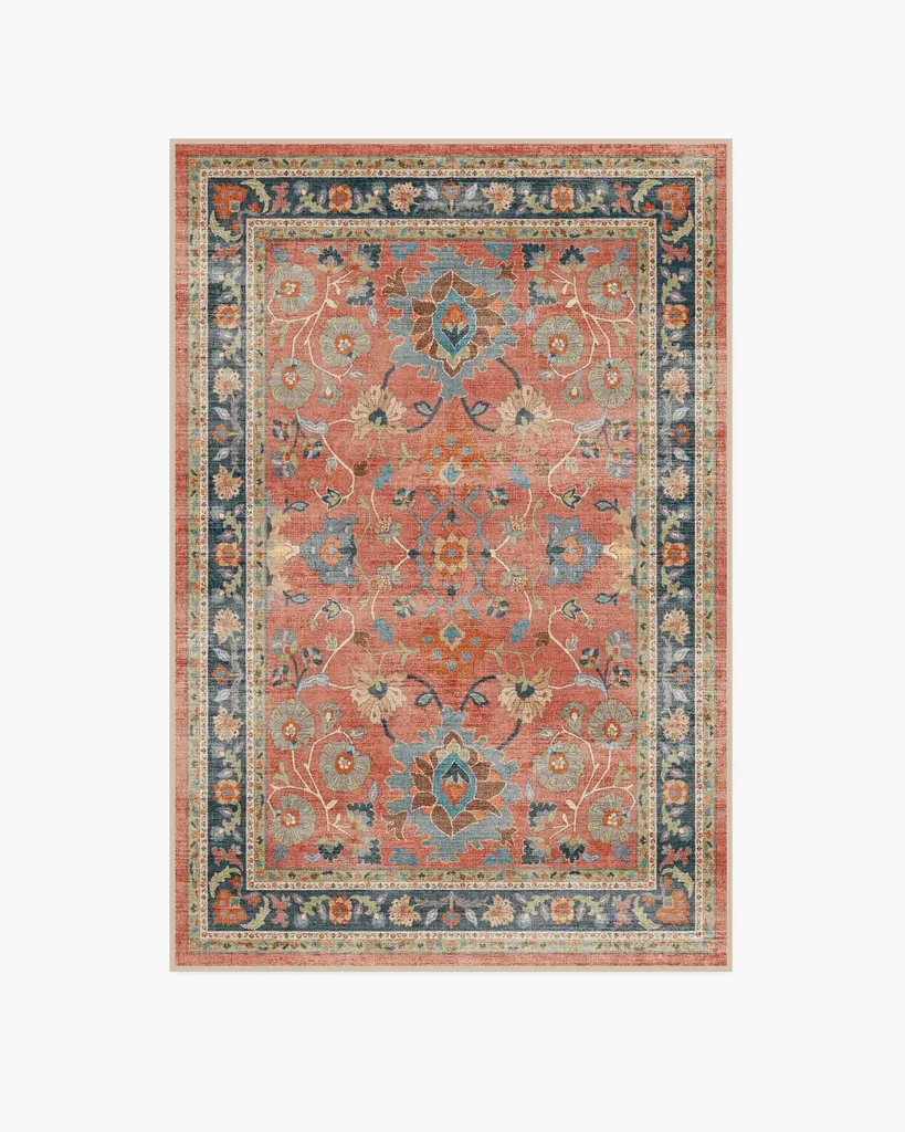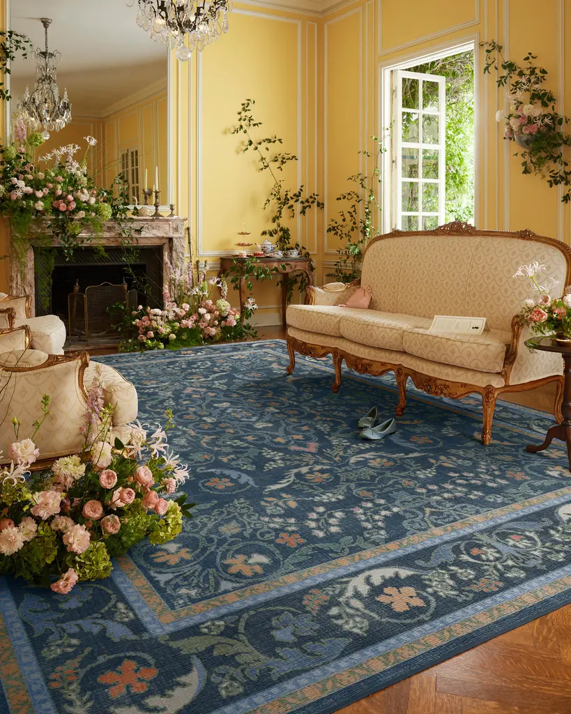 Make a grand entrance with our Bridgerton Fit for a Queen Blue Multicolor Rug. Inspired by ornate and embellished Regency-era interiors, this traditional rug design has whimsical floral motifs reminiscent of royal garden parties. The antiqued and distressed style features soft marigold, sage, cream and orange blooms against a dark blue background. Water-resistant, stain-resistant, and machine-washable. Rug colors may vary slightly according to your device and the lighting in your space.