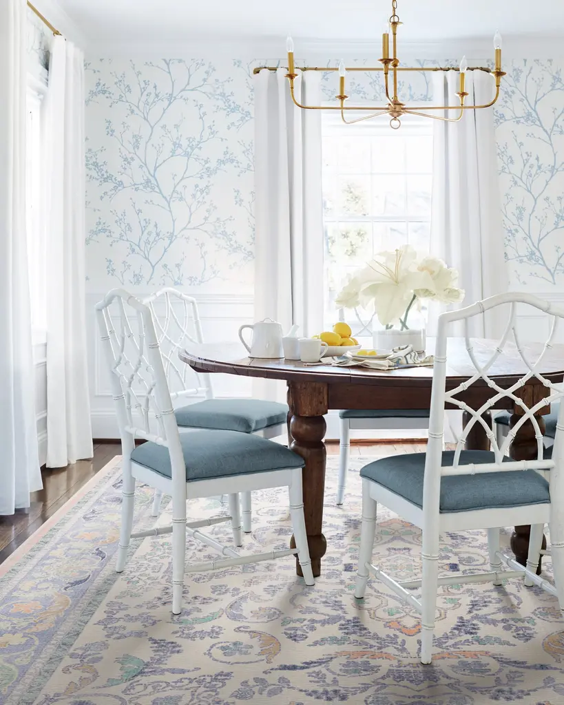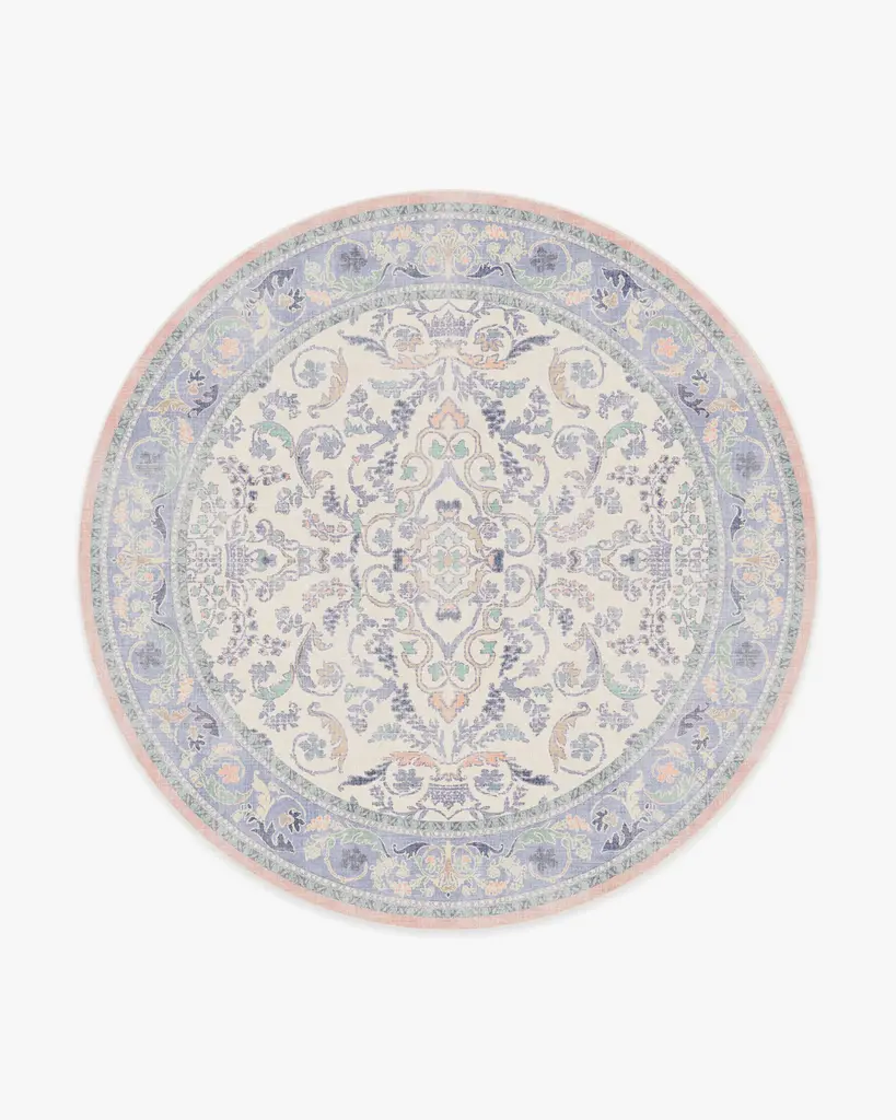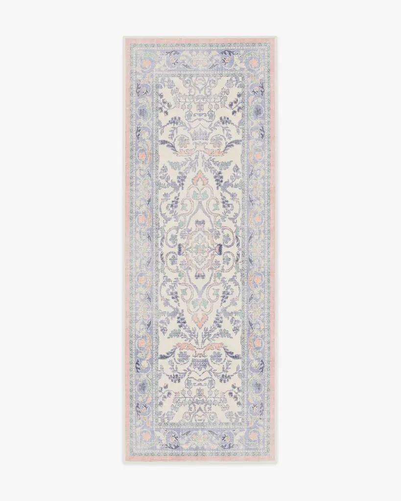 Make a grand entrance with our Bridgerton Fit for a Queen Soft Lavender Rug. Inspired by ornate and embellished Regency-era interiors, this traditional rug design has whimsical floral motifs reminiscent of royal garden parties. The antiqued and distressed style features soft lavender, blues, purples, peaches, and neutrals against a light cream background. Water-resistant, stain-resistant, and machine-washable. Rug colors may vary slightly according to your device and the lighting in your space.