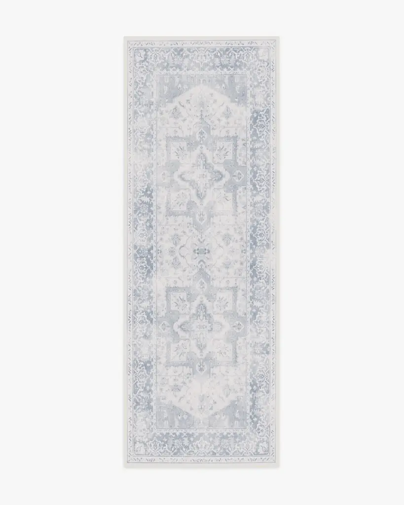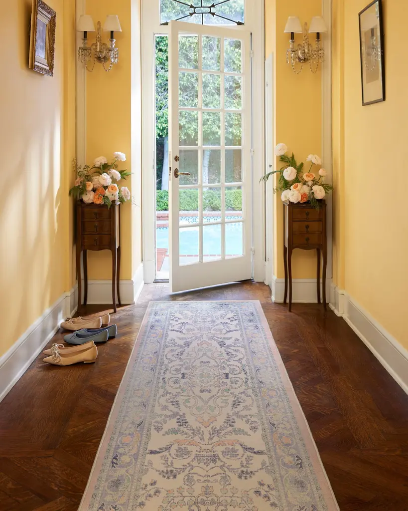 Make a grand entrance with our Bridgerton Fit for a Queen Soft Lavender Rug. Inspired by ornate and embellished Regency-era interiors, this traditional rug design has whimsical floral motifs reminiscent of royal garden parties. The antiqued and distressed style features soft lavender, blues, purples, peaches, and neutrals against a light cream background. Water-resistant, stain-resistant, and machine-washable. Rug colors may vary slightly according to your device and the lighting in your space.