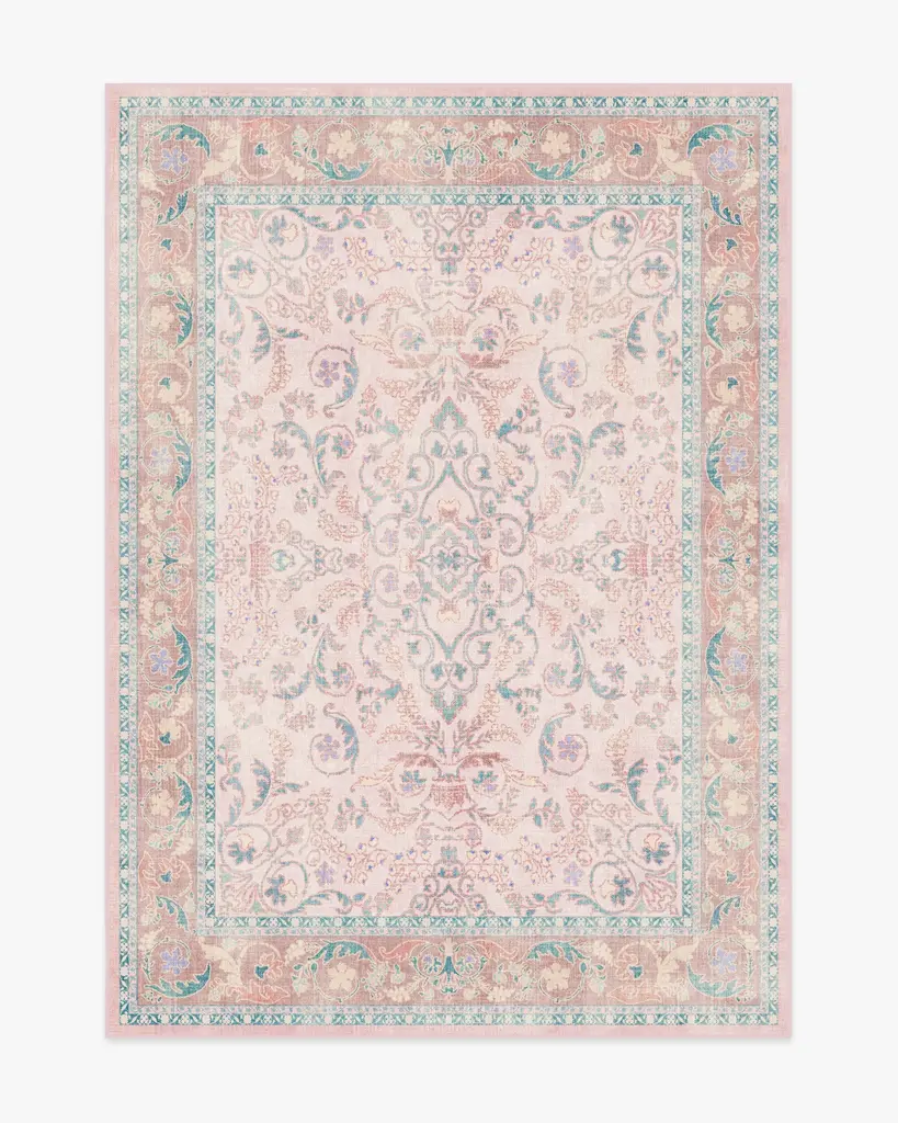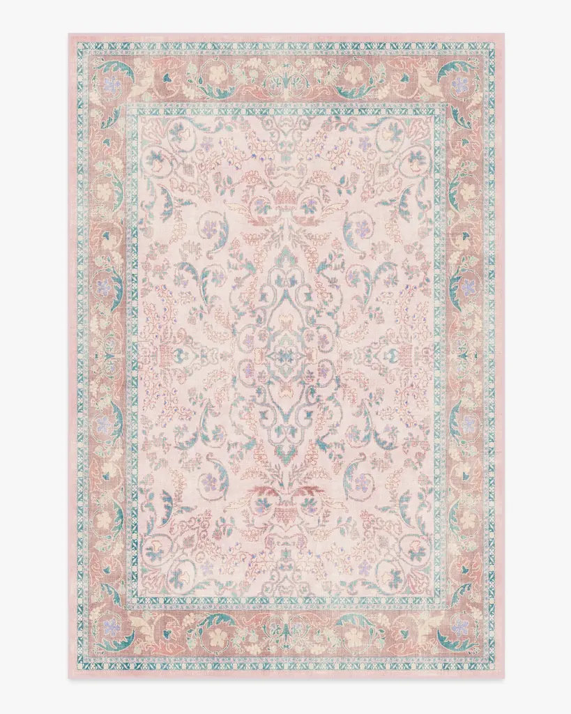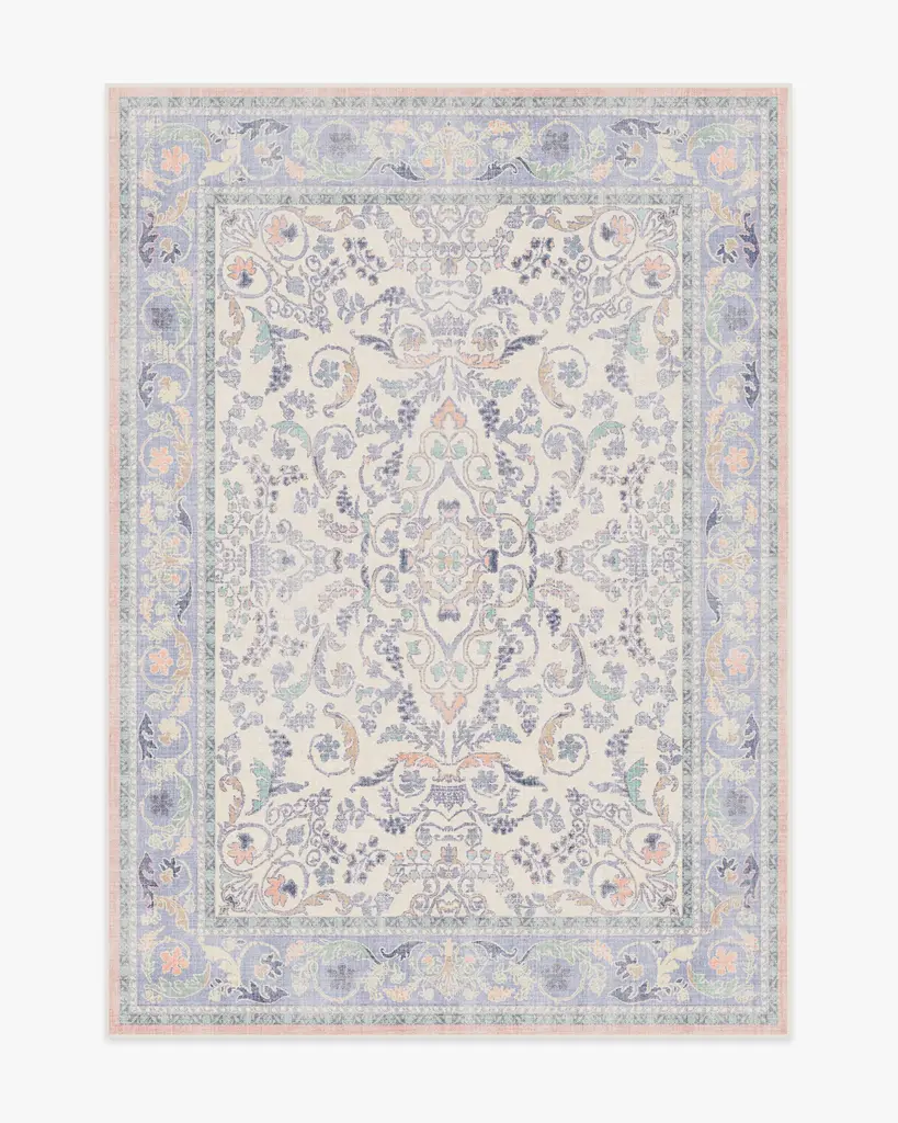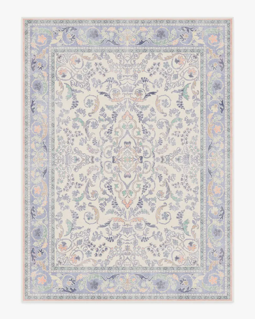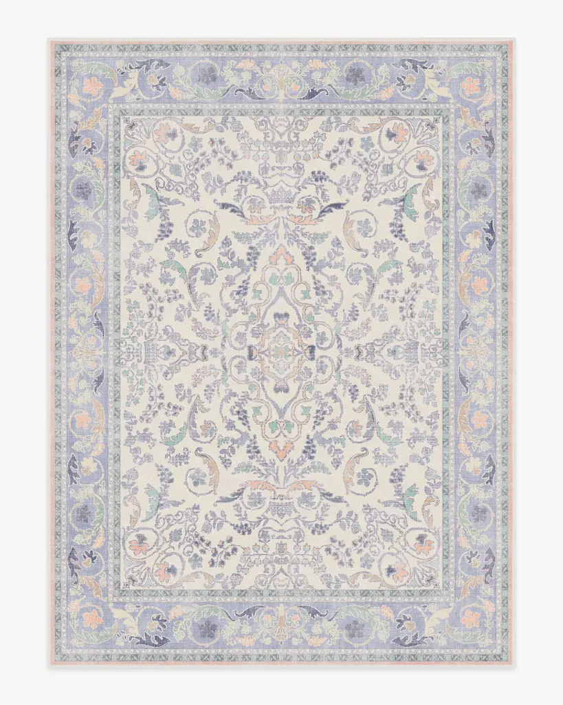 Make a grand entrance with our Bridgerton Fit for a Queen Soft Lavender Rug. Inspired by ornate and embellished Regency-era interiors, this traditional rug design has whimsical floral motifs reminiscent of royal garden parties. The antiqued and distressed style features soft lavender, blues, purples, peaches, and neutrals against a light cream background. Water-resistant, stain-resistant, and machine-washable. Rug colors may vary slightly according to your device and the lighting in your space.
