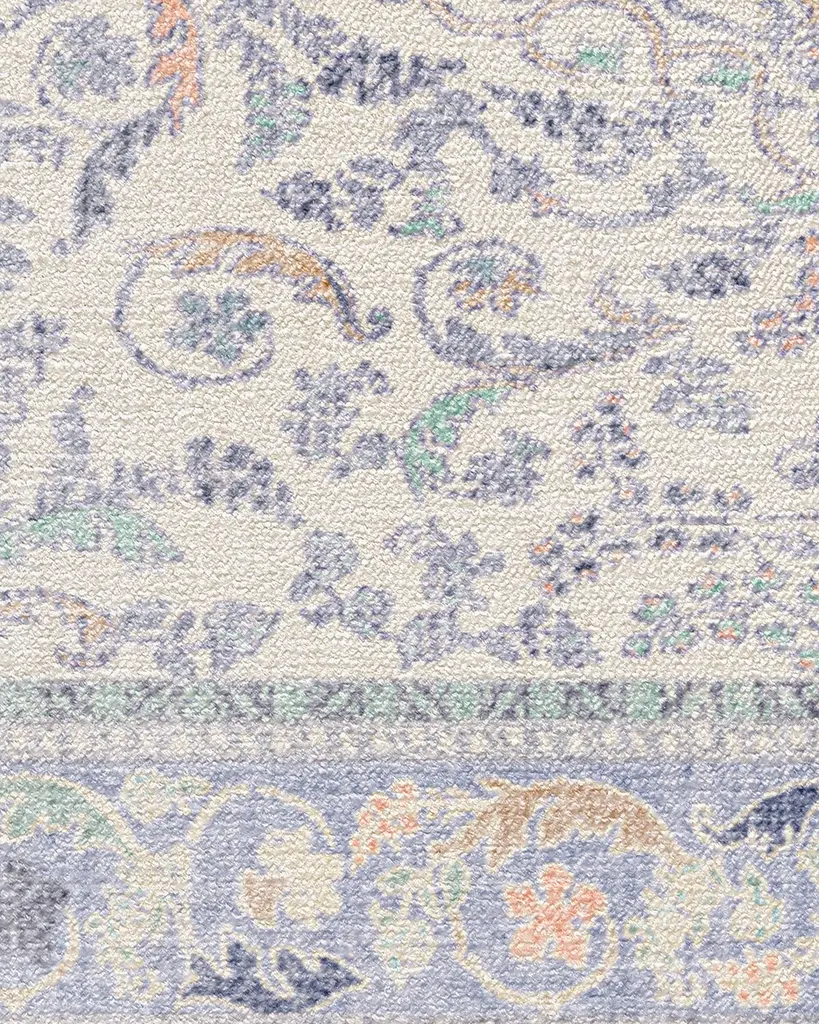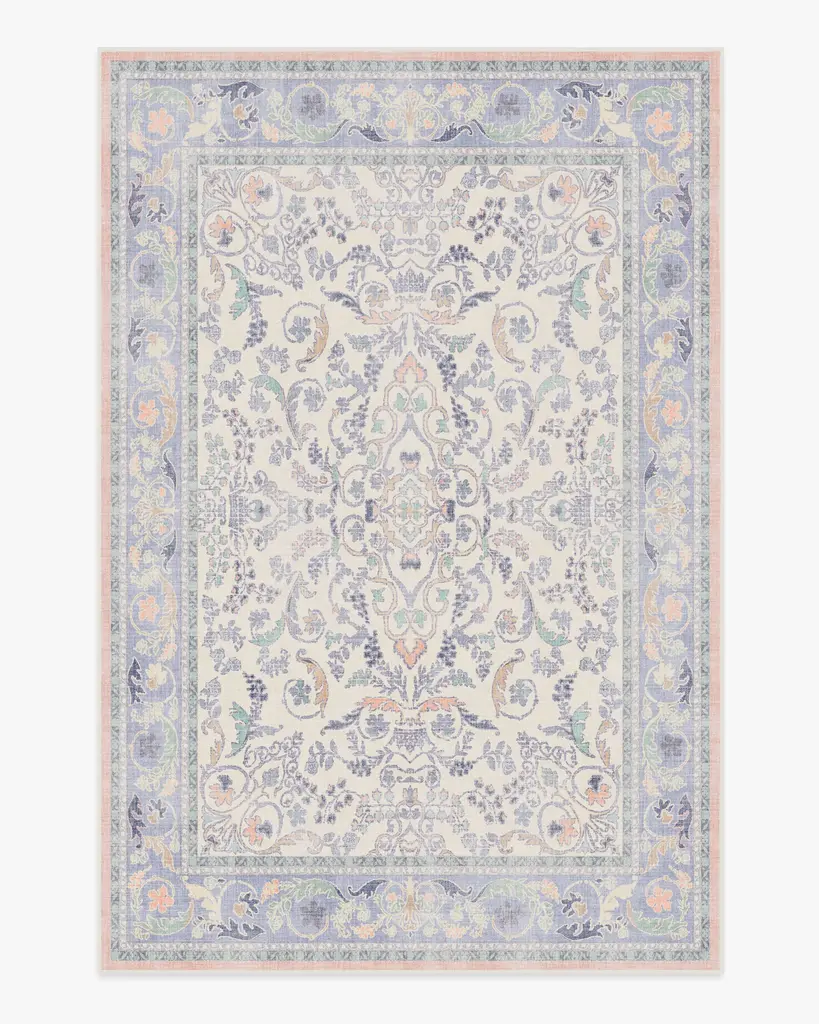Make a grand entrance with our Bridgerton Fit for a Queen Soft Lavender Rug. Inspired by ornate and embellished Regency-era interiors, this traditional rug design has whimsical floral motifs reminiscent of royal garden parties. The antiqued and distressed style features soft lavender, blues, purples, peaches, and neutrals against a light cream background. Water-resistant, stain-resistant, and machine-washable. Rug colors may vary slightly according to your device and the lighting in your space.