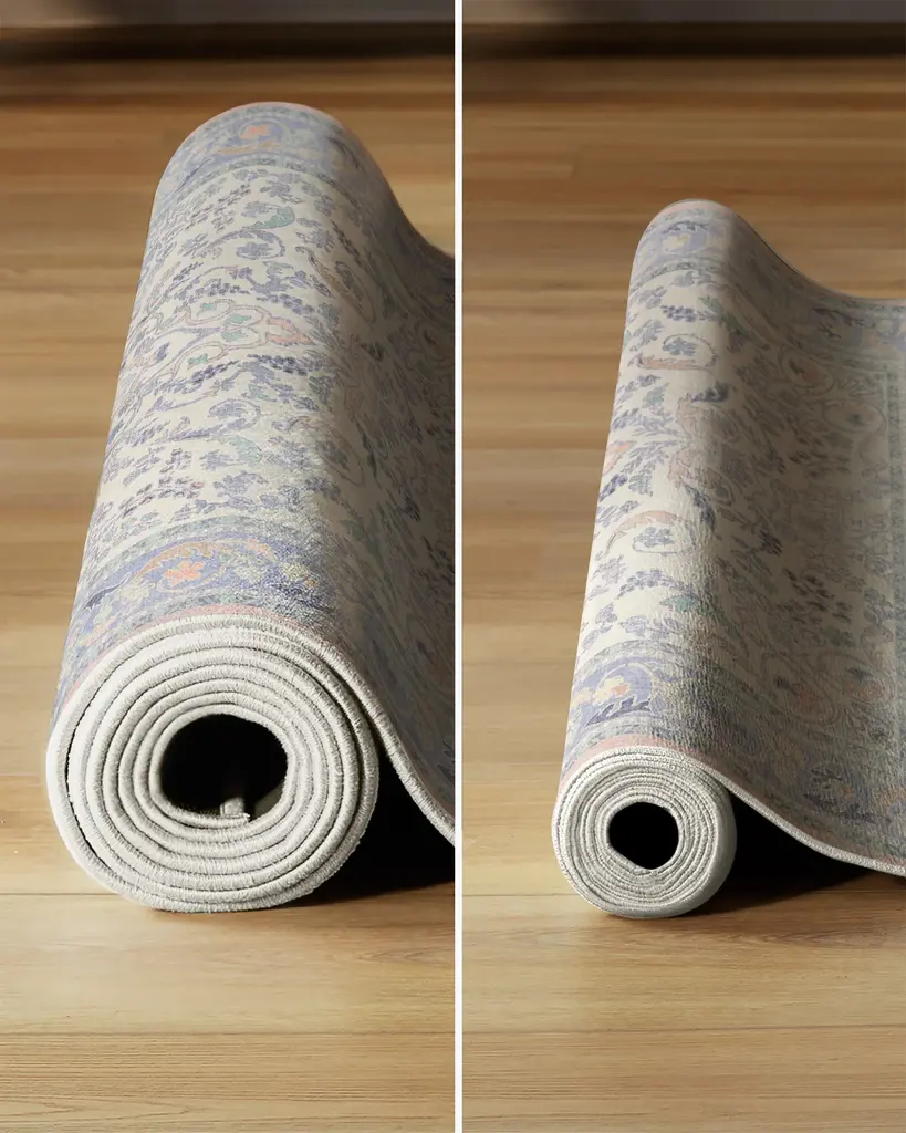 Make a grand entrance with our Bridgerton Fit for a Queen Soft Lavender Rug. Inspired by ornate and embellished Regency-era interiors, this traditional rug design has whimsical floral motifs reminiscent of royal garden parties. The antiqued and distressed style features soft lavender, blues, purples, peaches, and neutrals against a light cream background. Water-resistant, stain-resistant, and machine-washable. Rug colors may vary slightly according to your device and the lighting in your space.