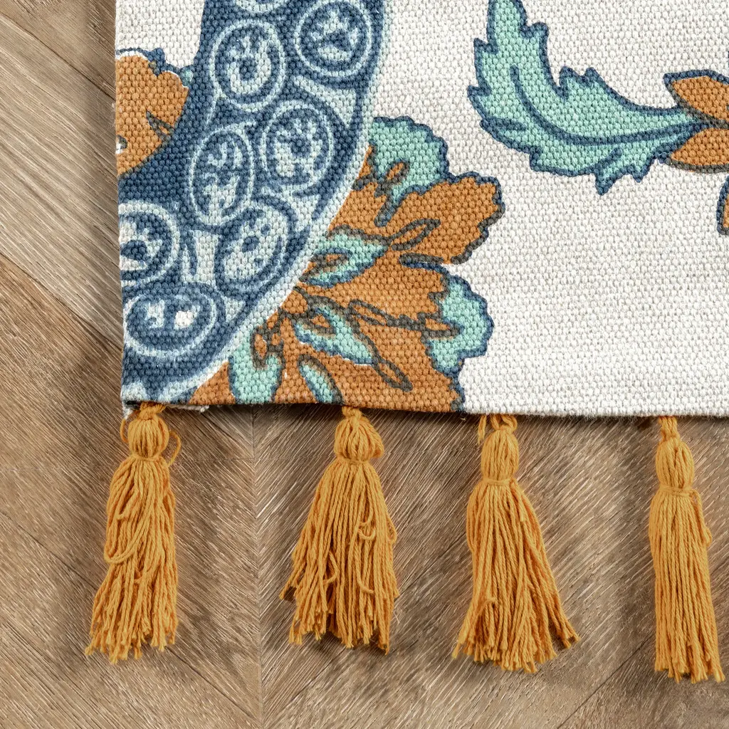 Let the one-of-a-kind look of this floor piece elevate your home! Crafted of luxurious cotton fibers, it features a flatweave octopus and floral pattern in a bold color scheme. Contrasting tassels around the edge add just the right amount flair, while its texture feels like the bliss of the ocean. Pair with nautical, coastal, bohemian, or contemporary decor. This area rug comes in a wide range of colors and sizes. Enjoy our stunning pet-friendly and easy to clean area rugs today.