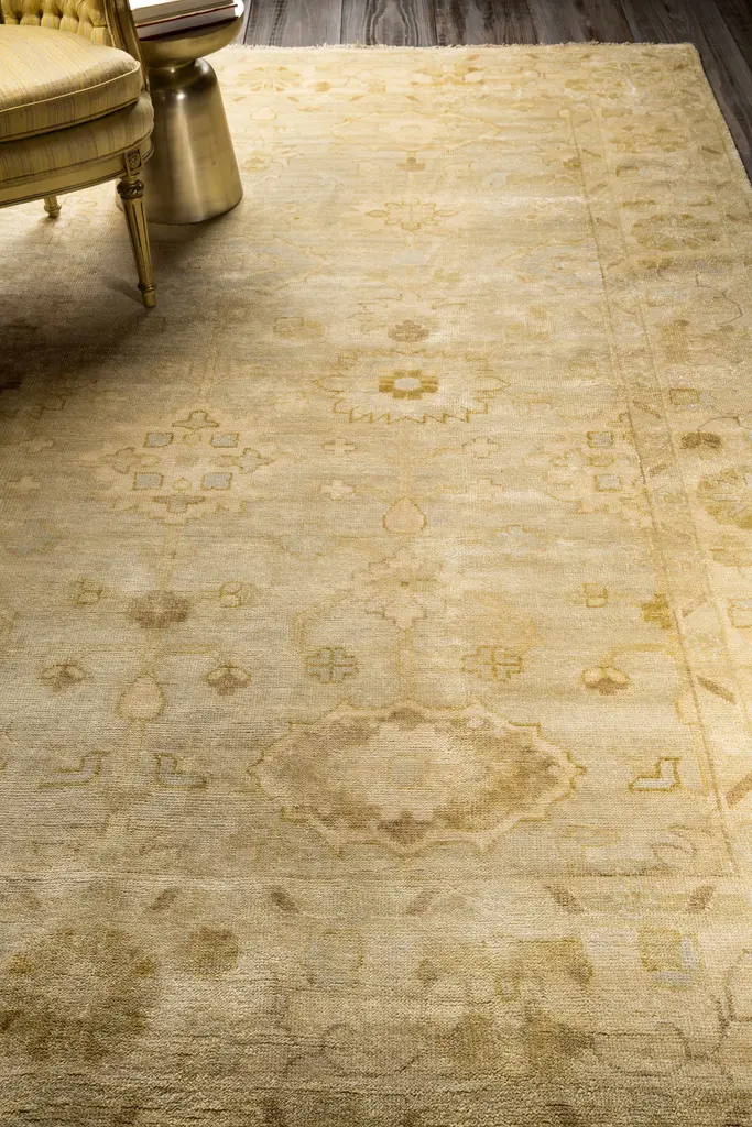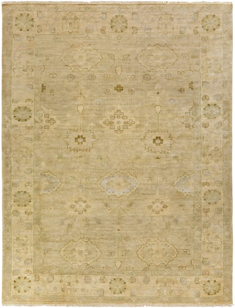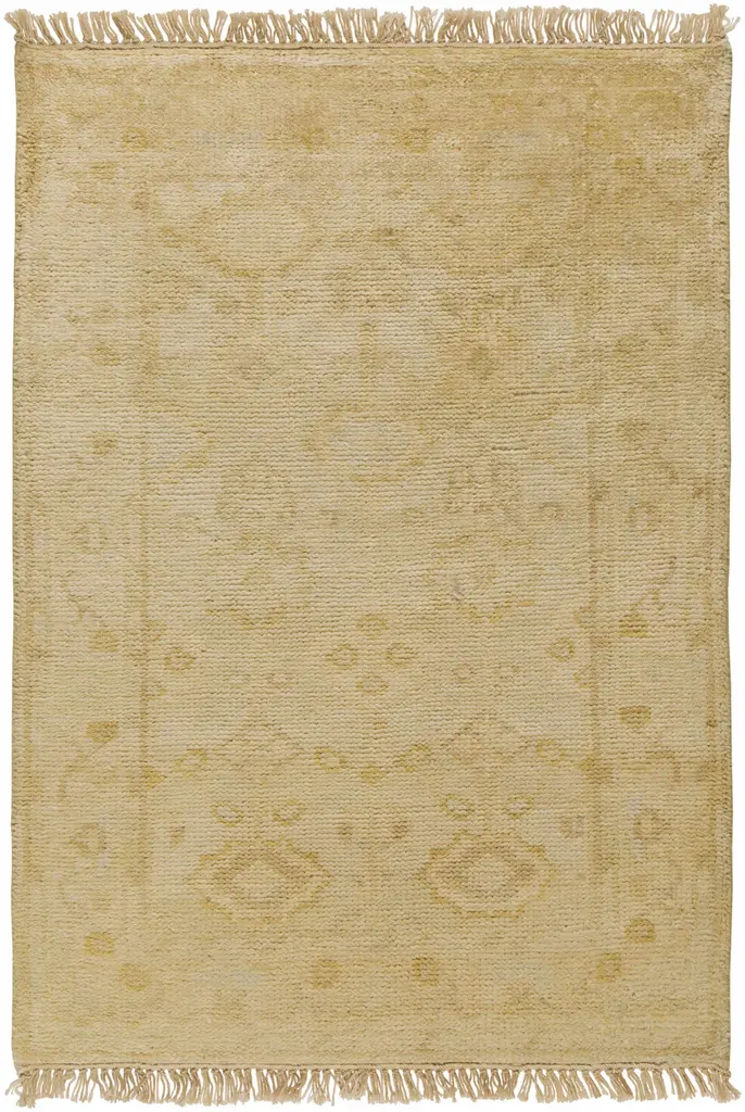 Collection: Flaxton Colors: Beige, Mustard, Olive Construction: Hand Knotted Material: 100% NZ Wool Pile: Low Pile Pile Height: 0.11" Styles: Traditional Made In: India Thickness: 0.24" Fringe Length: 1" Price Range: $$$$$ (Premium)