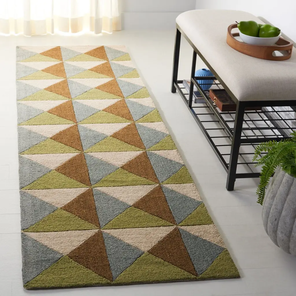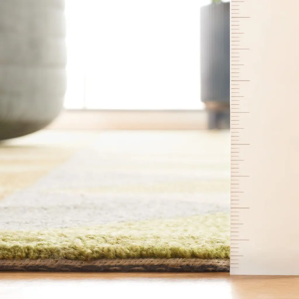 Elevate your living space with the understated elegance and modern flair of our 3' X 5' hand-tufted area rug. This exquisite piece is a testament to skilled craftsmanship, proudly made in India, and boasts a blend of 80% premium wool and 20% cotton, ensuring both durability and softness underfoot. Our small rectangle rug showcases a captivating geometric pattern that seamlessly intertwines shades of beige and green with subtle hints of blue and brown, rendering a delightful palette that complements any room. The contemporary design amplifies the visual appeal, making this rug an ideal centerpiece for your home or office. The modern style of the rug is emphasized by its clean lines and abstract form, which resonate with current interior trends while maintaining a timeless allure. With a perfect balance of comfort and aesthetic, this area rug not only enhances the appearance of your floors but also offers a plush, cozy surface for everyday activities. Dress your floors with this hand-tufted masterpiece, where luxurious feel meets contemporary sophistication, and transform your living space into an inviting haven of style.