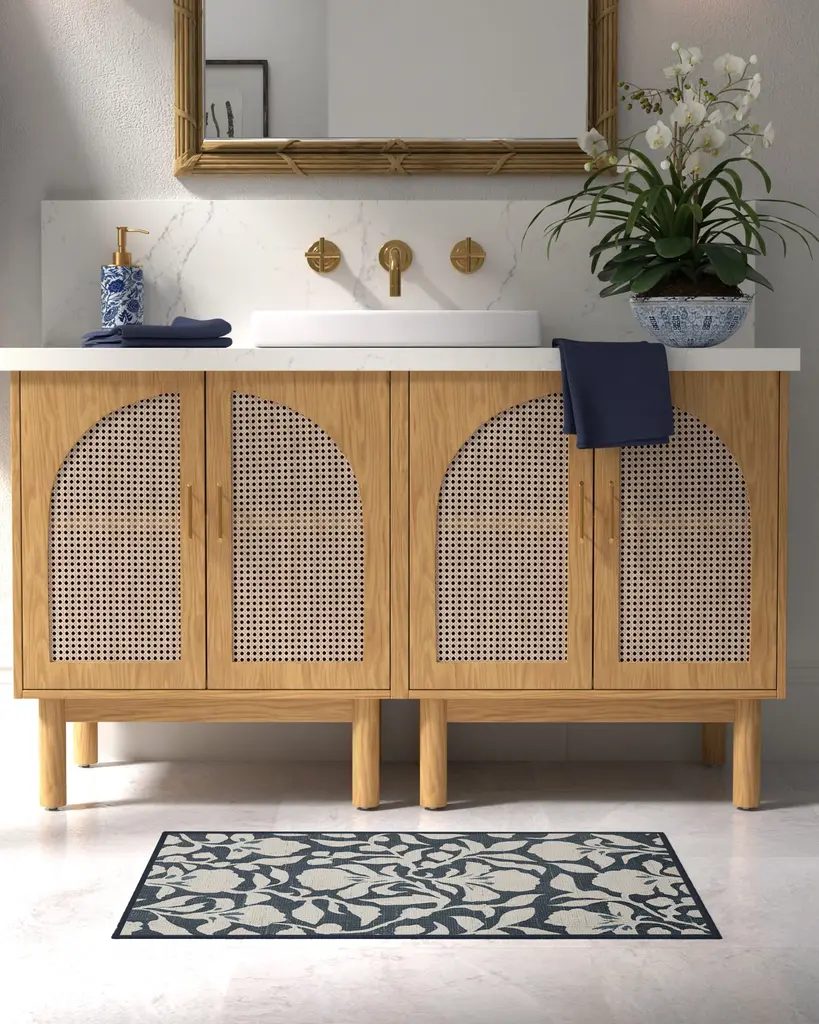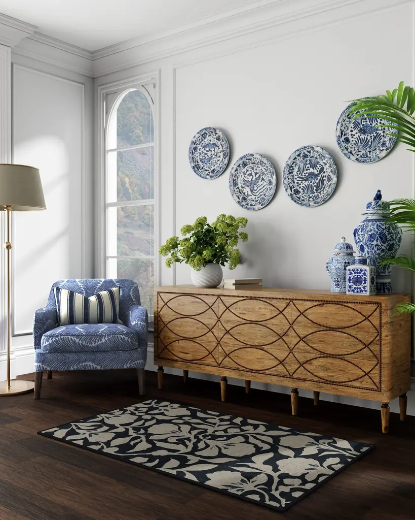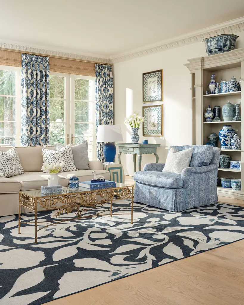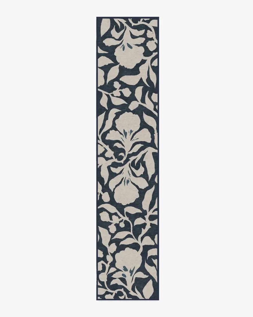 Style is in full bloom with The Hiltons Flora Ink Blue & Ivory Rug. Featuring two bold yet delicate flower motifs at its center, this floral design is filled with swirling petals, stems, and leaves that gracefully expand to each corner. The pretty, soft ivory motifs pop vividly against the deep navy background, adding a timeless garden-feel to any space. Water-resistant, stain-resistant, and machine-washable. Rug colors may vary slightly according to your device and the lighting in your space.