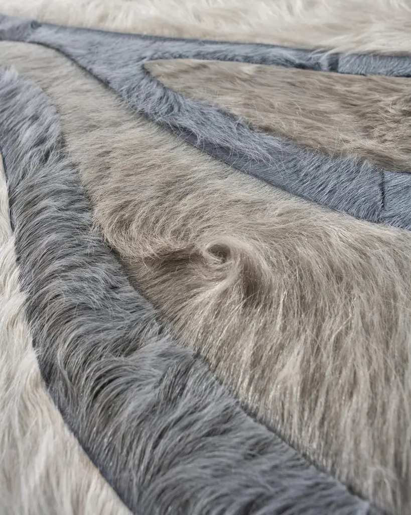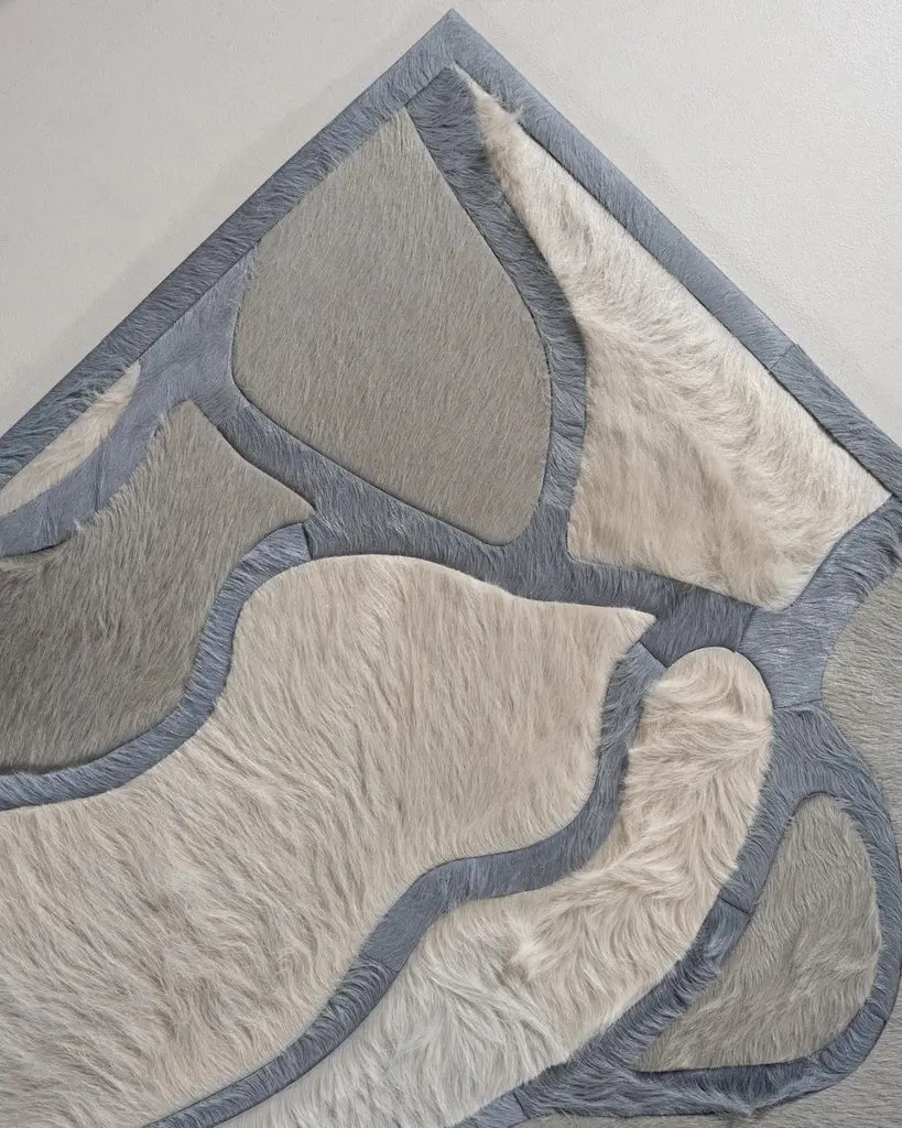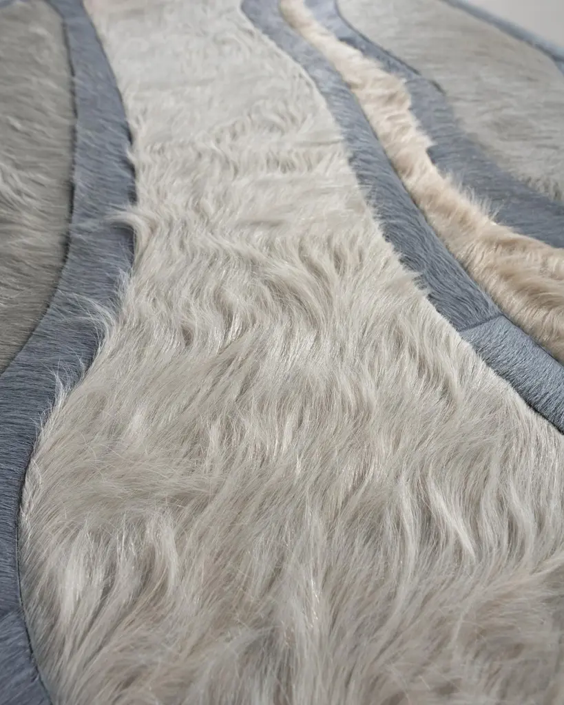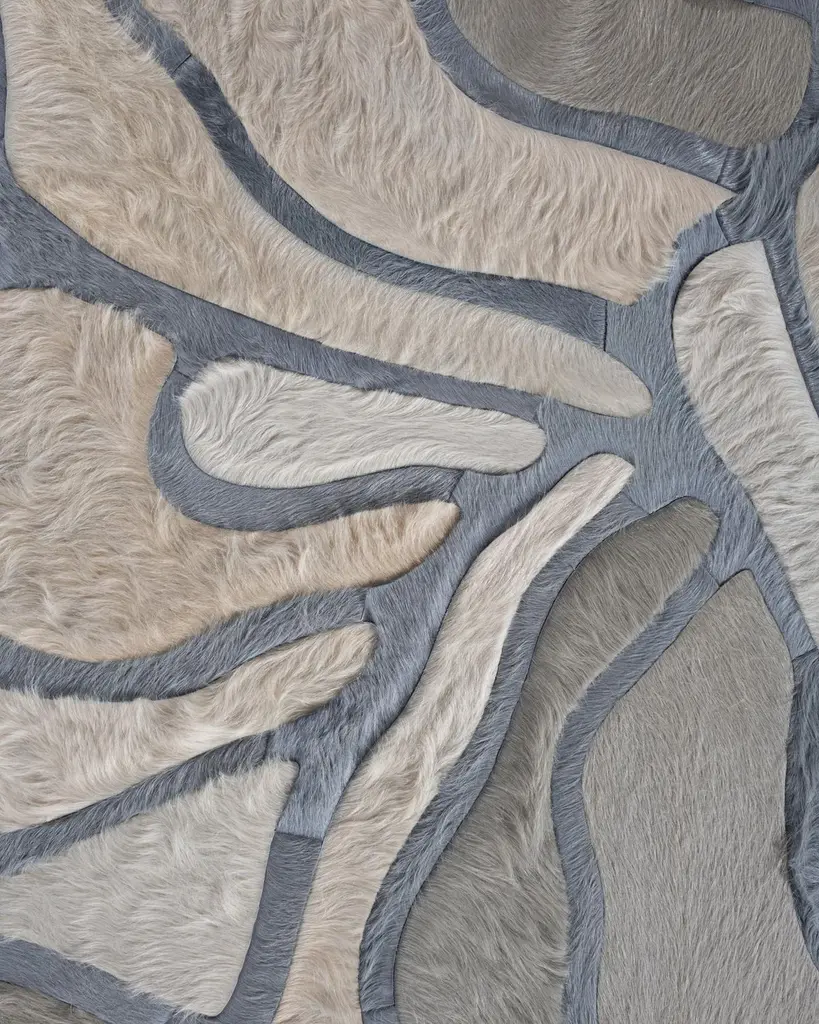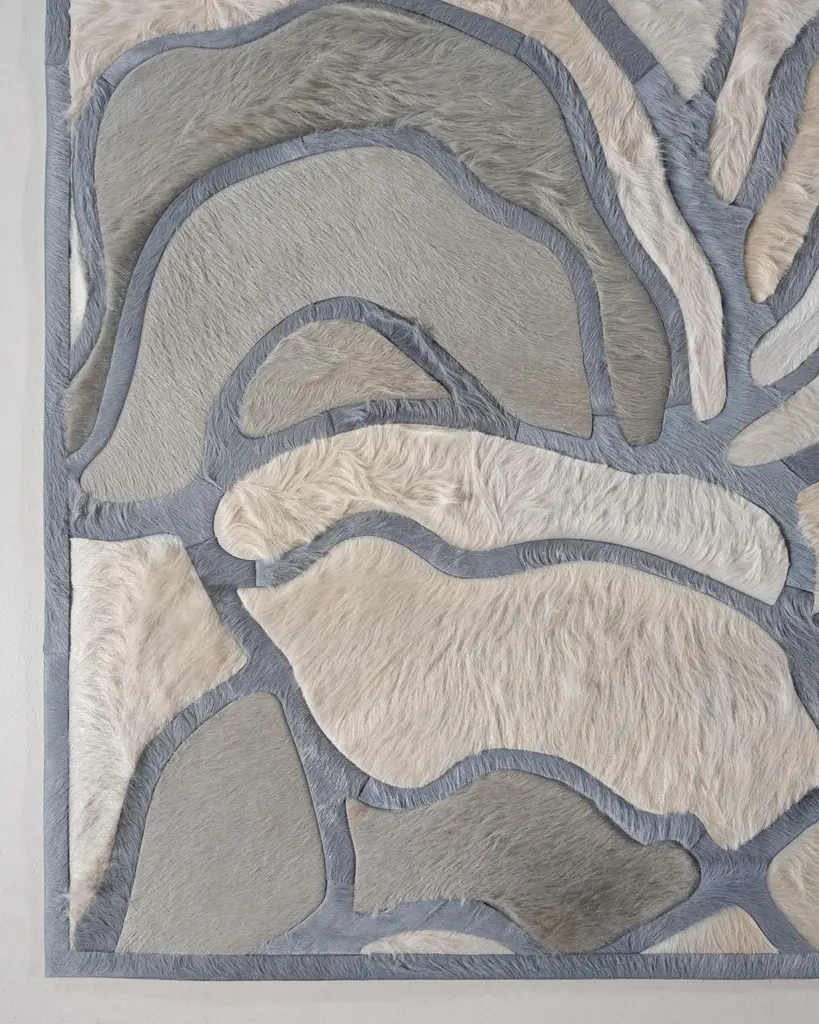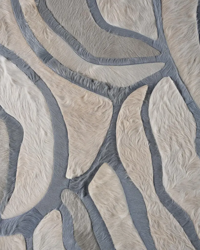 This Bloom Hide Rug was designed in collaboration between Kyle Bunting and Interior Designer Marc Thee for their 2018 rug collection. About the Design:The lush, overlapping blossoms of Bloom, harnessed only by the border that surrounds them, appropriately symbolize rebirth through the coming of a new season. Best realized in bright and bold color palettes.Materials & Assembly:This rug will be made from the finest French Charolais leather that has been dyed in Italy before being imported to the USA where it will be assembled by hand by artisans.Non-Slip Backing:This item comes with a proprietary non-slip backing which eliminates the need for a rug pad.Design Colors:Aluminum;Cream;Smoke