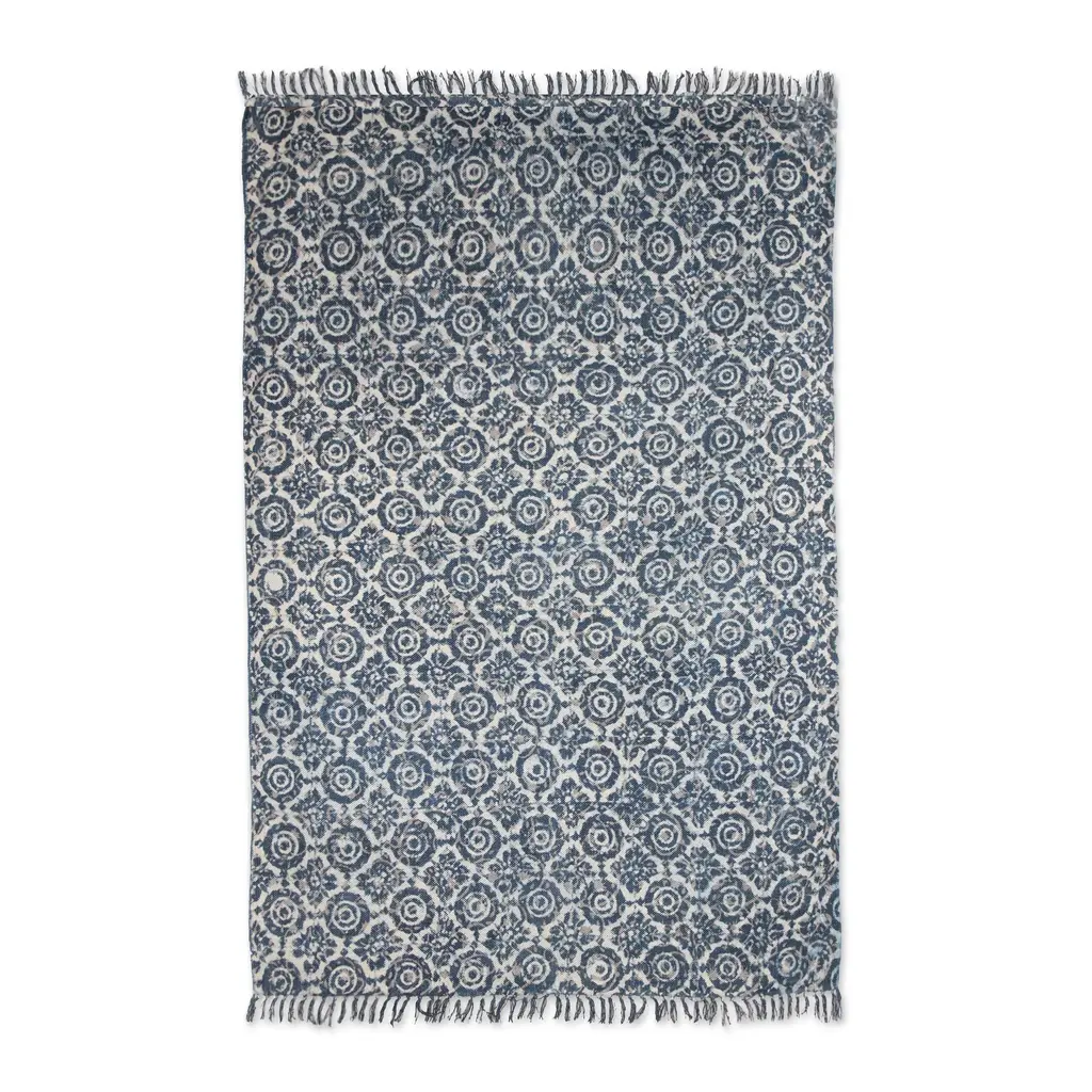 Presented by Sonik Sethi in India, this fantastic area rug evokes royalty. Intricate floral motifs in azure and snow white are diligently block printed by hand on cotton woven on a traditional loom. Petite fringe work accents the ends of this rug.