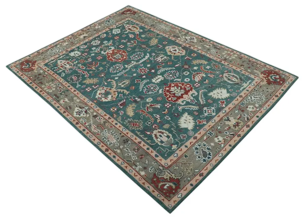 Experience the timeless elegance of our Antique Floral Teal, Camel and Brown Hand Knotted Oriental Oushak Multi Size wool Area Rug. Crafted with intricate floral patterns and hand knotting techniques, this rug adds a touch of old-world charm to any room. The luxurious wool material offers both durability and comfort. Hand-Knotted Made with Wool Made to Order in 30-45 Days Color : Teal, Camel and Brown This specific rug is made in India, in the city of Bhadohi. Bhadohi is one of the biggest rug manufacturing cities. Carpet weaving in the region dates back to the 16th century during the reign of Akbar. The skilled artisans of Bhadohi have been carrying the tradition of rug-making for centuries. USERS GUIDE Avoid prolonged moisture Vacuum regularly and/or shake to remove dust Do not pull any loose threads. Use scissors to simply cut the ends Blot spills immediately with a white cloth. Harsh chemicals may damage or fade the rug Use rug protectors under heavy furniture