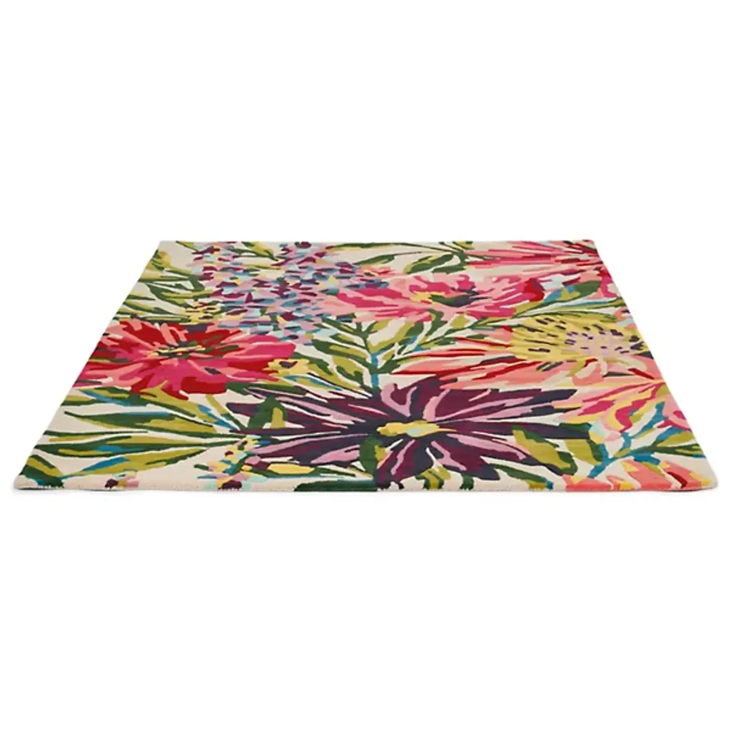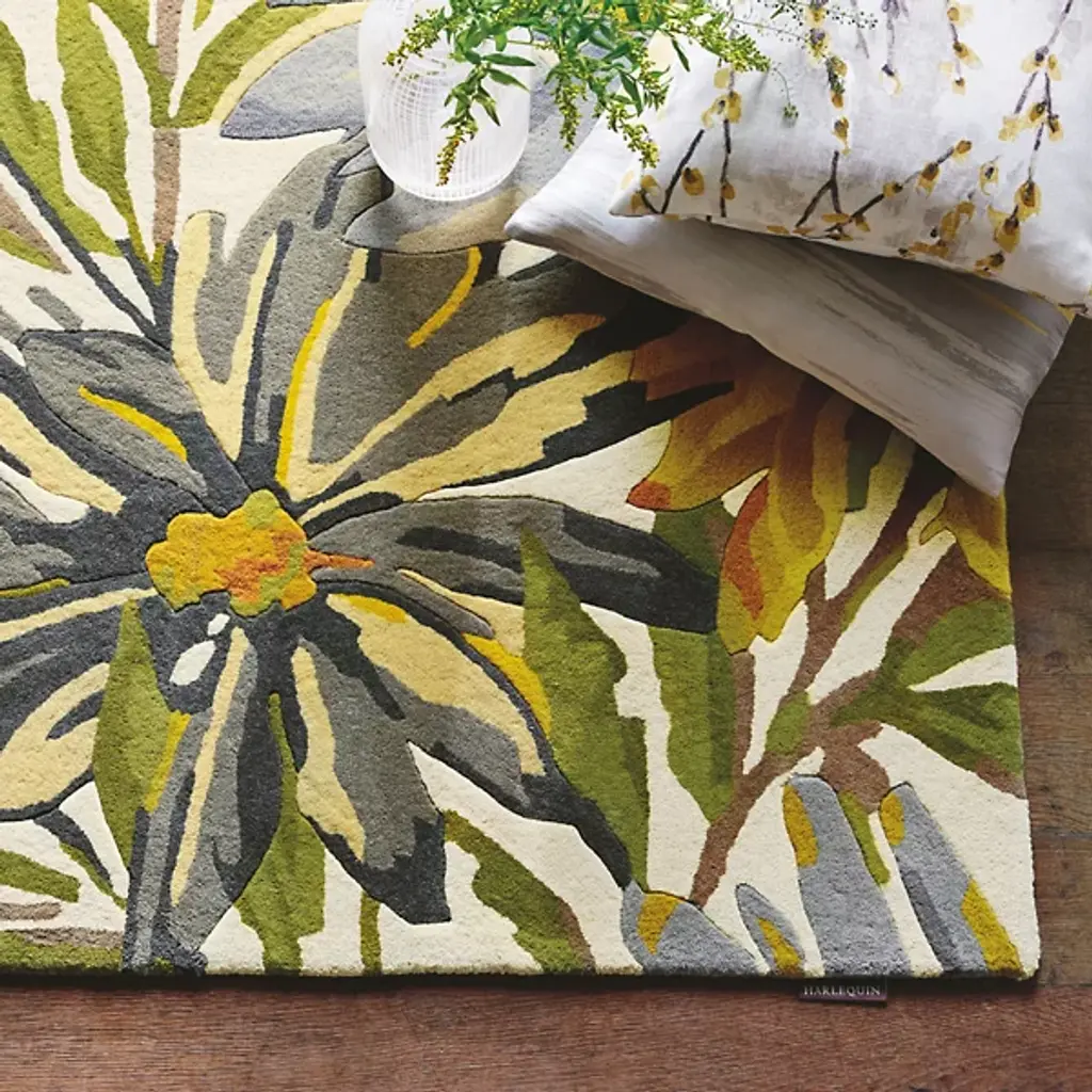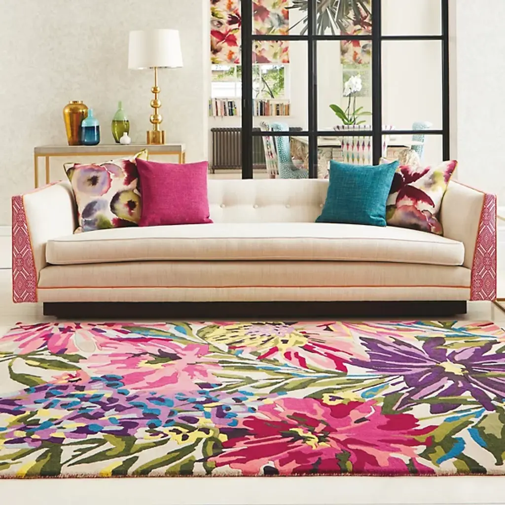 The Floreale Area Rug from Harlequin explodes with tropical blooms in saturated colors that command immediate attention. Handtufted from pure new wool in India, oversized flowers compete for space across every inch of the surface without leaving room for background breathing space. Bold petals overlap in dense arrangements that create constant visual activity and energy. Reserve this statement piece for large, minimally furnished rooms where its exuberant pattern can dominate, or use it as the room's primary color source.