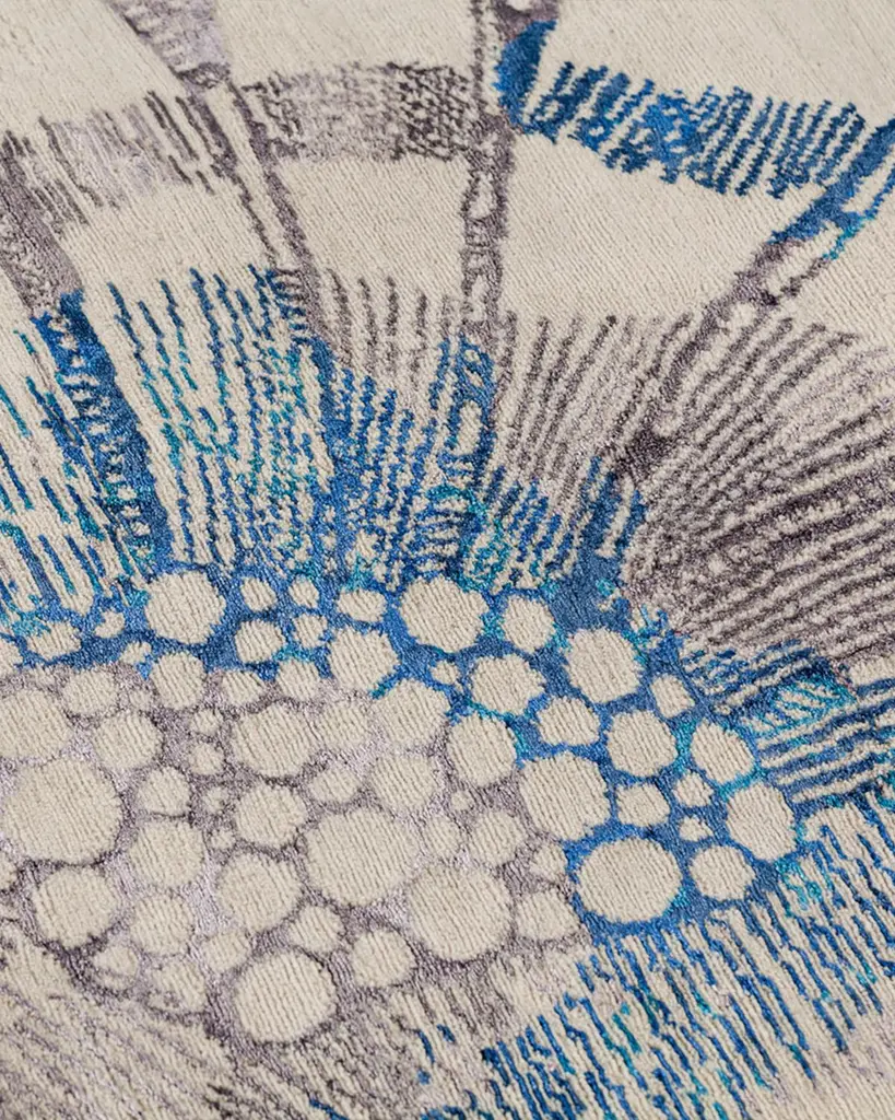 Flores Profumo Rectangular 360 Rug in Hand - Knotted Bamboo Silk by MohebbanDimensions: W 360 x L 270 cmMaterials: Wool.In the Profumo collection, designed by Marta Giardini, vibrant shades of color in bamboo silk and soft wool draw subjects of botanical inspiration through an ancient artisanal process. The elements of nature - leaves, flowers, pistils and corollas - seem to trace gravitational waves, drawn shapes, complex geometries and a succession of lines that recall the aerial vision of fields moved by the wind. The multiplication of signs is a complex circuit in which harmonious textures are intertwined, an infinite play of full and empty spaces and in which style and elegance belong to a contemporaneity not limited only to the present.The carpet is not a simple furnishing accessory: it is a culture that has been handed down for generations, with wise gestures and refined techniques. With its shape it defines a physical but also spiritual space, and through the knots it tells an ancient and contemporary story, contributing to enriching the private universe of its owner with beauty and uniqueness. A responsibility not to be underestimated, of which the Mohebban family is fully aware. Since the early 1970s, Mohebban has been producing carpets of the highest quality, without forgetting these values and the profound meaning of a thousand-year-old art. From Iran, the family's place of origin, to Milan, the company's headquarters for more than half a century, passing through Turkey, India and Pakistan where production takes place today: for three generations an international vision, in which tradition, attention to detail, ancient gestures find their place, always accompanied by a contemporary look, attentive to design and the challenges of a dynamic and constantly evolving present.