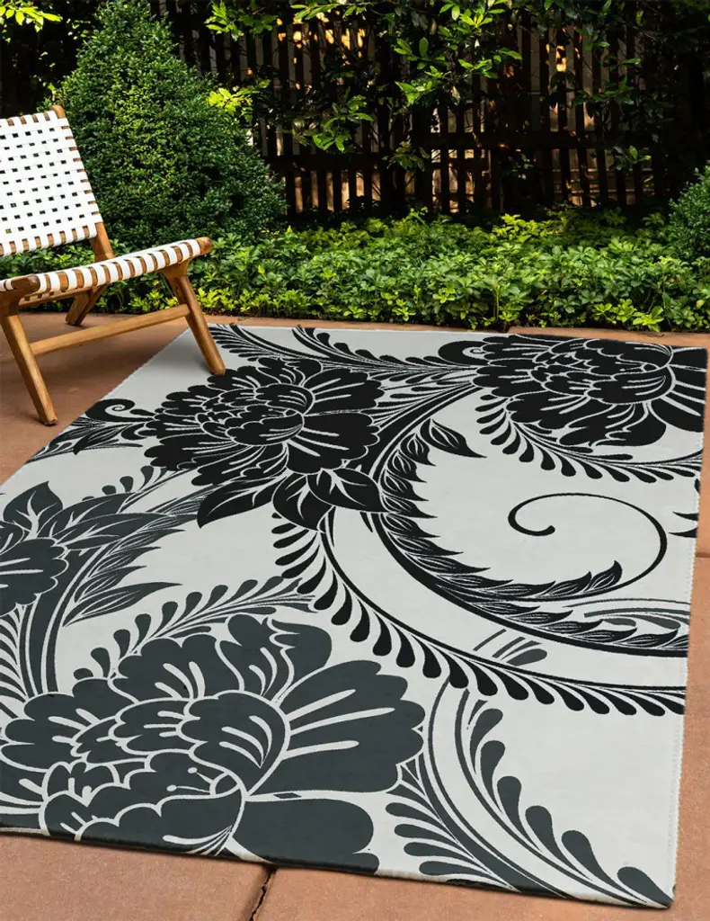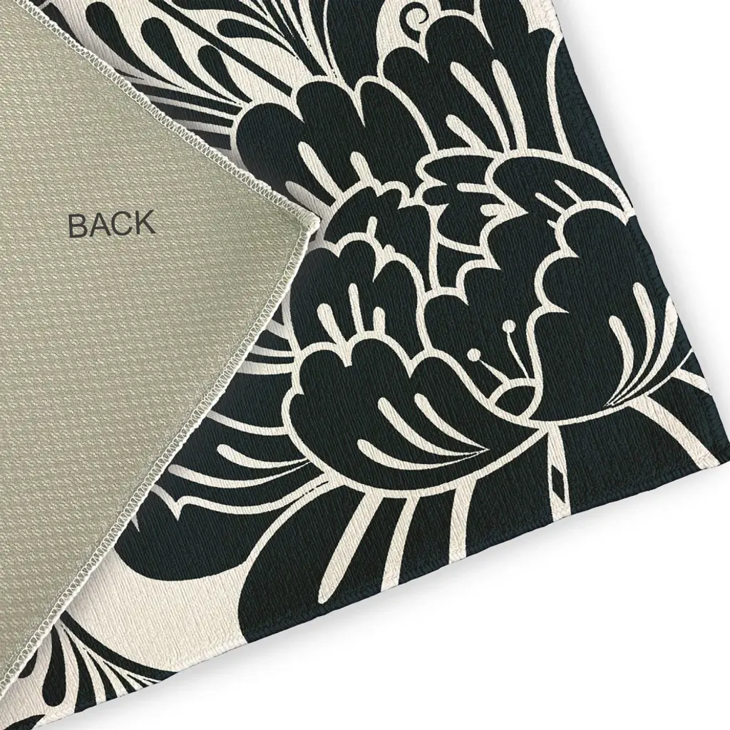 Add a floral touch to enhance your home decor with a Flower Flourish Indoor/outdoor Rug from our Botanical Blooms Collection. Everyone will delight in the space defining design brought to your porch, patio, kitchen, or bathroom by this area rug. The artistic and colorful design is printed on a soft polyester base with a skid resistant backing, making it a perfect way to add color, flare and personality to any indoor or outdoor space. To clean, use a mild soap and lay flat to dry.