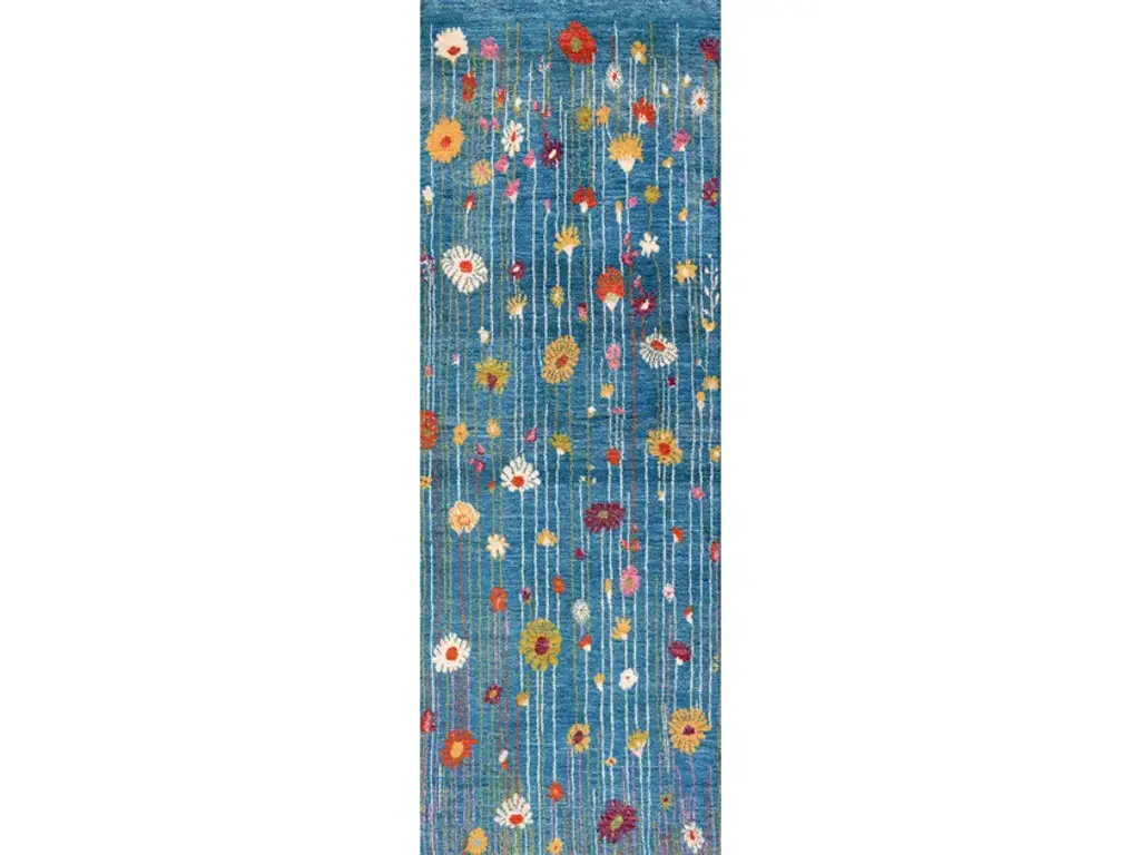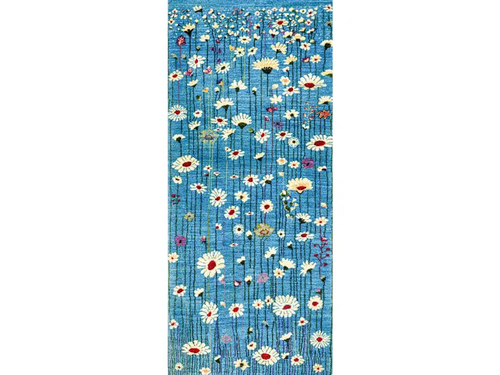 Flower Meadow 17 is a rectangular wool rug.Zollanvari Super Fine.Bursting with the joys of summer meadows filled with dancing daisies the original design of this Gabbeh is naturalistic and surreal at the same time. The designer/weaver have cleverly transported us to a field of dreams... Never-never Land perhaps? The juxtaposition of the bright and contrasting colours of the flowers on the delicately abrashed woollen ground creates a sense of natural movement in this design, as if a gentle breeze is blowing through this magical meadow that stretches out to the horizon... an amazing sense of perspective that takes one's breath away.