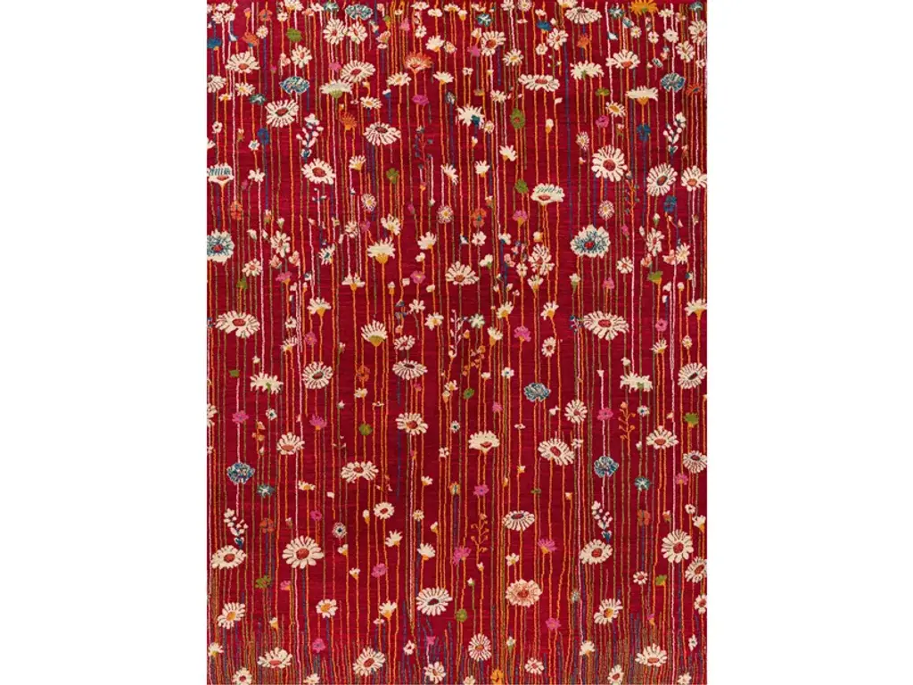 Flower Meadow 19 is a rectangular wool rug.Zollanvari Super Fine.Bursting with the joys of summer meadows filled with dancing daisies the original design of this Gabbeh is naturalistic and surreal at the same time. The designer/weaver have cleverly transported us to a field of dreams... Never-never Land perhaps? The juxtaposition of the bright and contrasting colours of the flowers on the delicately abrashed woollen ground creates a sense of natural movement in this design, as if a gentle breeze is blowing through this magical meadow that stretches out to the horizon... an amazing sense of perspective that takes one's breath away.