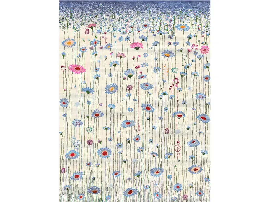 Flower Meadow 22 is a rectangular wool rug.Zollanvari Super Fine.Bursting with the joys of summer meadows filled with dancing daisies the original design of this Gabbeh is naturalistic and surreal at the same time. The designer/weaver have cleverly transported us to a field of dreams... Never-never Land perhaps? The juxtaposition of the bright and contrasting colours of the flowers on the delicately abrashed woollen ground creates a sense of natural movement in this design, as if a gentle breeze is blowing through this magical meadow that stretches out to the horizon... an amazing sense of perspective that takes one's breath away.