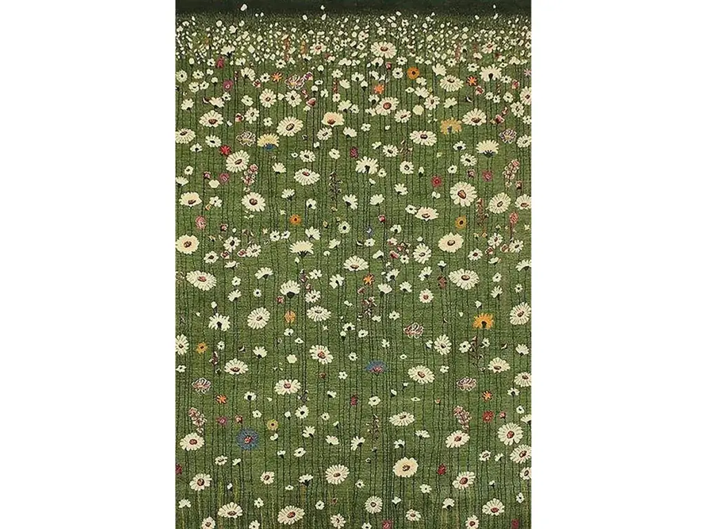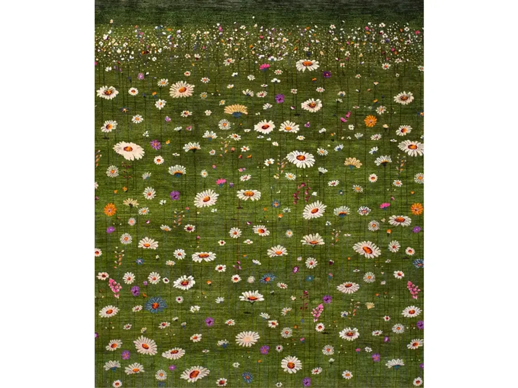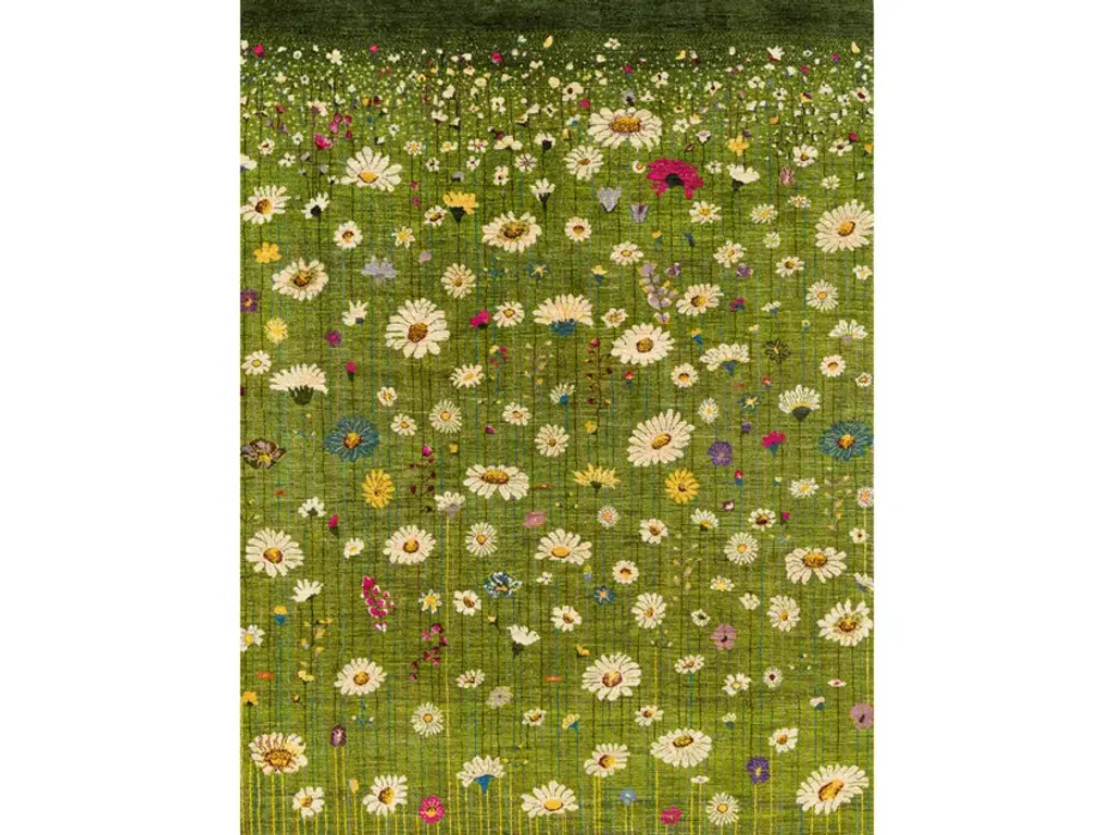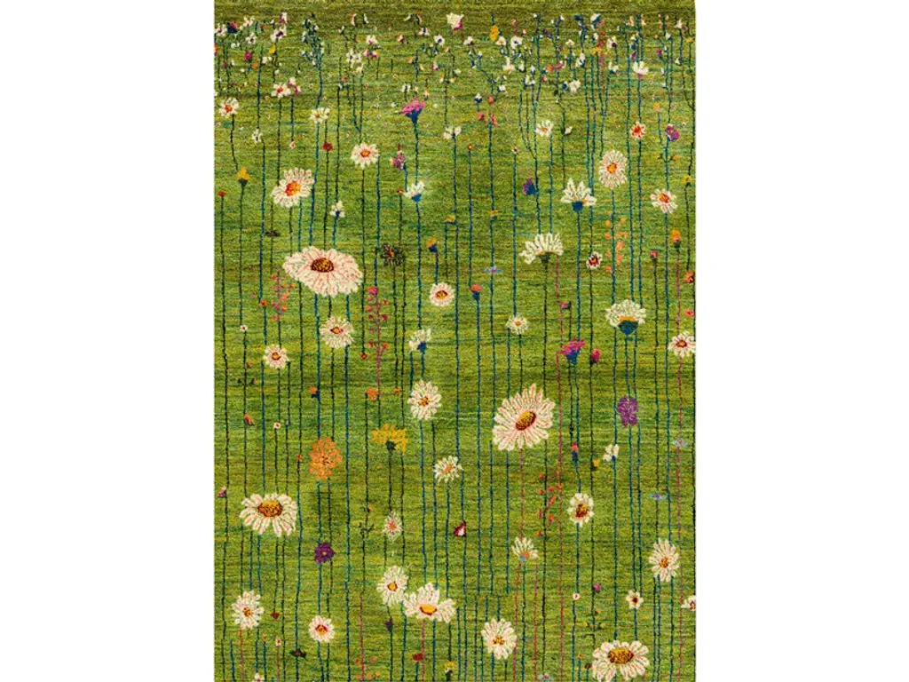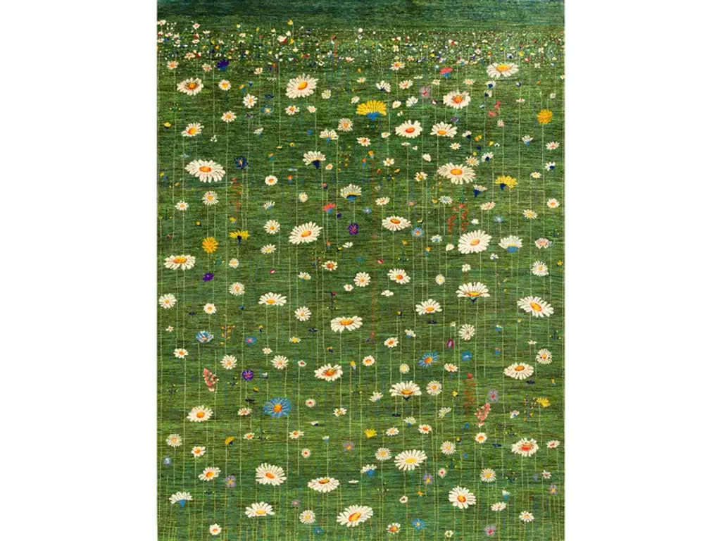 Flower Meadow 30 is a rectangular wood rug.Zollanvari Super Fine.Bursting with the joys of summer meadows filled with dancing daisies the original design of this Gabbeh is naturalistic and surreal at the same time. The designer/weaver have cleverly transported us to a field of dreams... Never-never Land perhaps? The juxtaposition of the bright and contrasting colours of the flowers on the delicately abrashed woollen ground creates a sense of natural movement in this design, as if a gentle breeze is blowing through this magical meadow that stretches out to the horizon... an amazing sense of perspective that takes one's breath away.